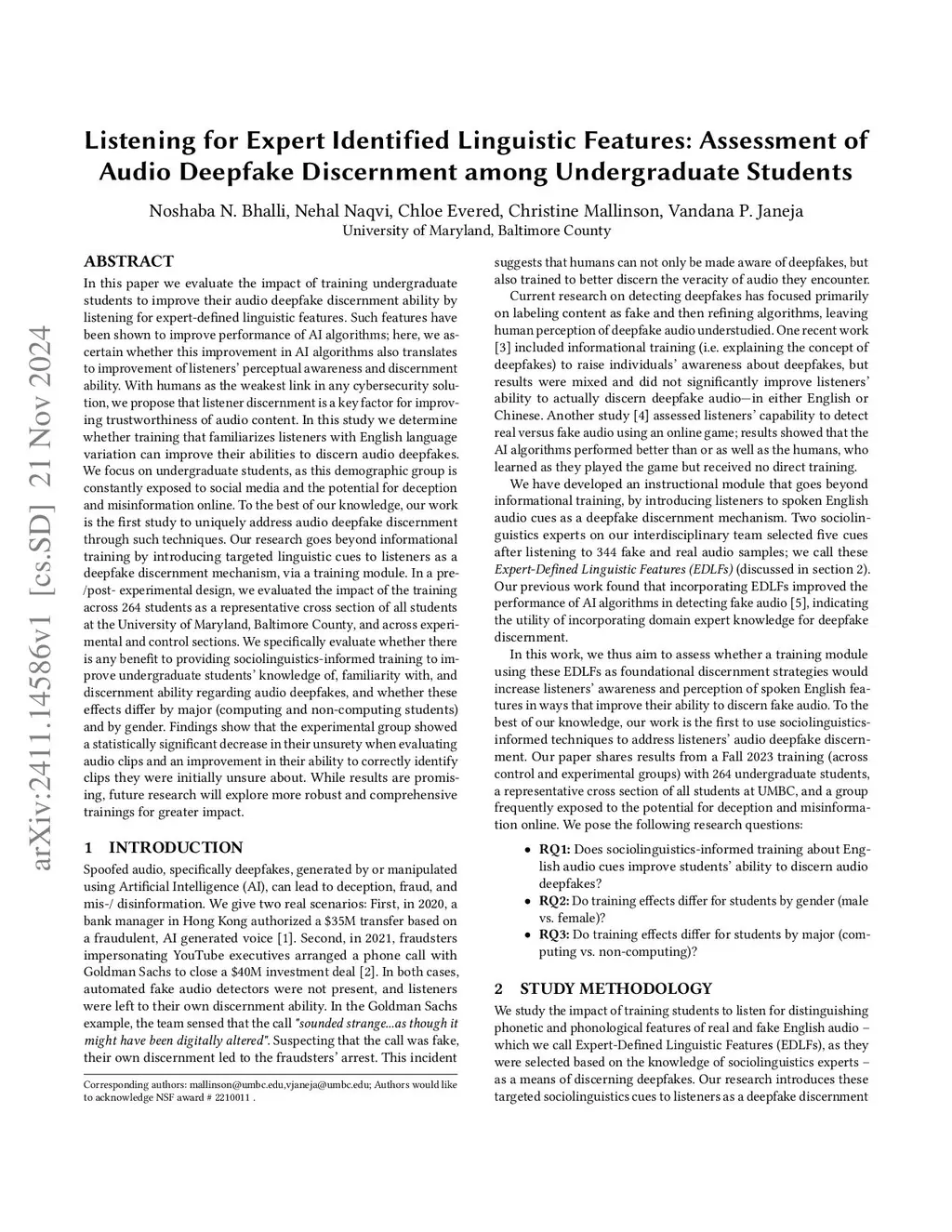 This paper evaluates the impact of training undergraduate students to improve their audio deepfake discernment ability by listening for expert-defined linguistic features. Such features have been shown to improve performance of AI algorithms; here, we ascertain whether this improvement in AI algorithms also translates to improvement of the perceptual awareness and discernment ability of listeners. With humans as the weakest link in any cybersecurity solution, we propose that listener discernment is a key factor for improving trustworthiness of audio content. In this study we determine whether training that familiarizes listeners with English language variation can improve their abilities to discern audio deepfakes. We focus on undergraduate students, as this demographic group is constantly exposed to social media and the potential for deception and misinformation online. To the best of our knowledge, our work is the first study to uniquely address English audio deepfake discernment through such techniques. Our research goes beyond informational training by introducing targeted linguistic cues to listeners as a deepfake discernment mechanism, via a training module. In a pre-/post- experimental design, we evaluated the impact of the training across 264 students as a representative cross section of all students at the University of Maryland, Baltimore County, and across experimental and control sections. Findings show that the experimental group showed a statistically significant decrease in their unsurety when evaluating audio clips and an improvement in their ability to correctly identify clips they were initially unsure about. While results are promising, future research will explore more robust and comprehensive trainings for greater impact.