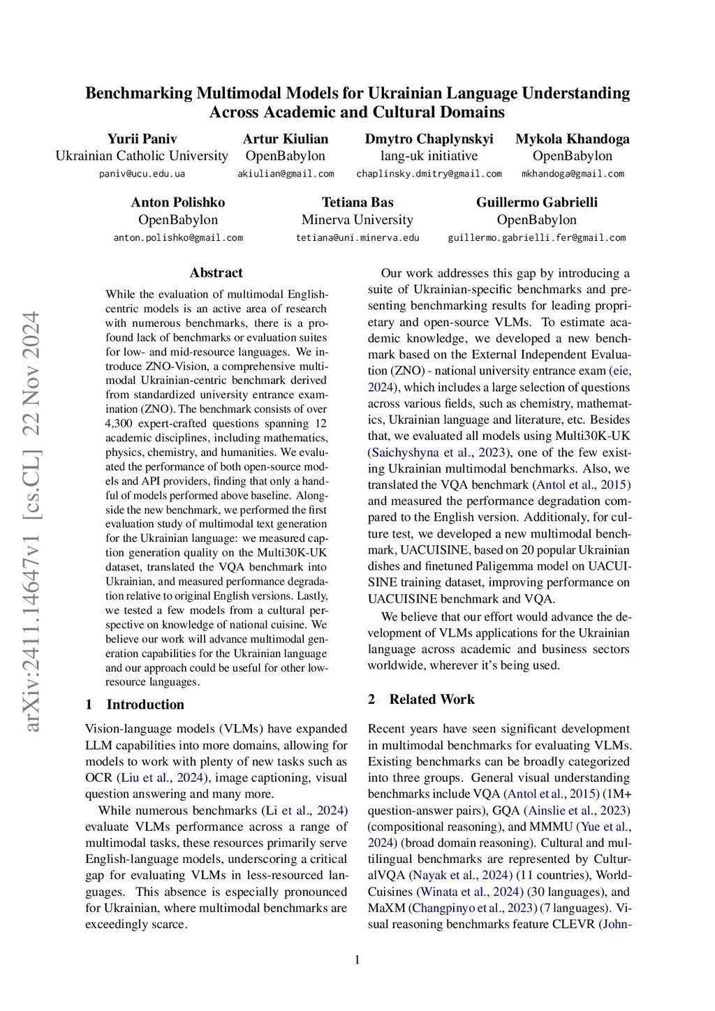 While the evaluation of multimodal English-centric models is an active area of research with numerous benchmarks, there is a profound lack of benchmarks or evaluation suites for low- and mid-resource languages. We introduce ZNO-Vision, a comprehensive multimodal Ukrainian-centric benchmark derived from standardized university entrance examination (ZNO). The benchmark consists of over 4,300 expert-crafted questions spanning 12 academic disciplines, including mathematics, physics, chemistry, and humanities. We evaluated the performance of both open-source models and API providers, finding that only a handful of models performed above baseline. Alongside the new benchmark, we performed the first evaluation study of multimodal text generation for the Ukrainian language: we measured caption generation quality on the Multi30K-UK dataset, translated the VQA benchmark into Ukrainian, and measured performance degradation relative to original English versions. Lastly, we tested a few models from a cultural perspective on knowledge of national cuisine. We believe our work will advance multimodal generation capabilities for the Ukrainian language and our approach could be useful for other low-resource languages.