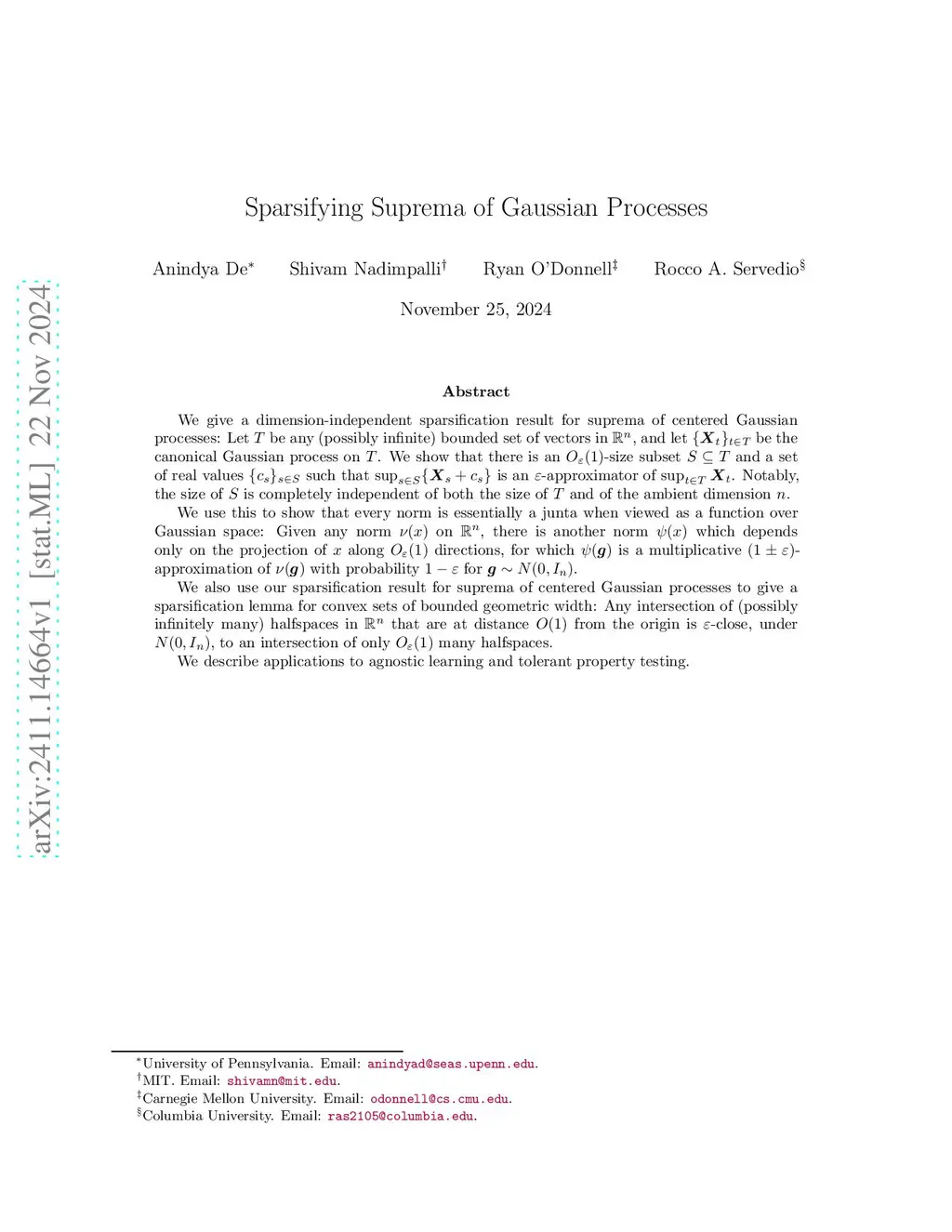 We give a dimension-independent sparsification result for suprema of centered Gaussian processes: Let be any (possibly infinite) bounded set of vectors in , and let be the canonical Gaussian process on , where . We show that there is an -size subset and a set of real values such that the random variable is an -approximator\,(in ) of the random variable . Notably, the size of the sparsifier is completely independent of both and the ambient dimension .We give two applications of this sparsification theorem:- A "Junta Theorem" for Norms: We show that given any norm on , there is another norm depending only on the projection of onto directions, for which is a multiplicative -approximation of with probability for .- Sparsification of Convex Sets: We show that any intersection of (possibly infinitely many) halfspaces in that are at distance from the origin is -close (under ) to an intersection of only halfspaces. This yields new polynomial-time \emph{agnostic learning} and \emph{tolerant property testing} algorithms for intersections of halfspaces.