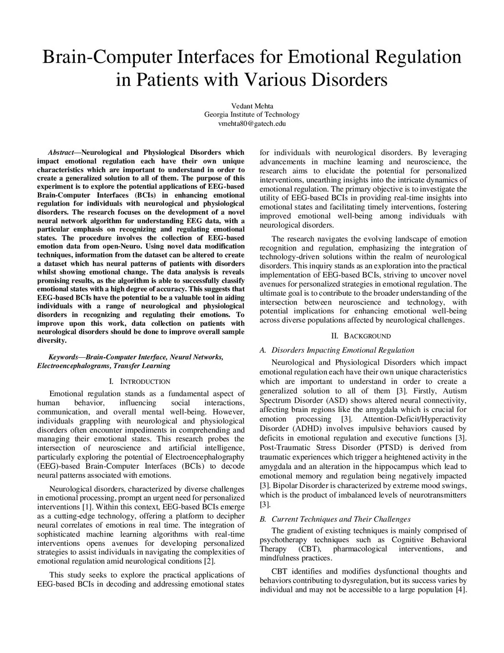 Neurological and Physiological Disorders that impact emotional regulation each have their own unique characteristics which are important to understand in order to create a generalized solution to all of them. The purpose of this experiment is to explore the potential applications of EEG-based Brain-Computer Interfaces (BCIs) in enhancing emotional regulation for individuals with neurological and physiological disorders. The research focuses on the development of a novel neural network algorithm for understanding EEG data, with a particular emphasis on recognizing and regulating emotional states. The procedure involves the collection of EEG-based emotion data from open-Neuro. Using novel data modification techniques, information from the dataset can be altered to create a dataset that has neural patterns of patients with disorders whilst showing emotional change. The data analysis reveals promising results, as the algorithm is able to successfully classify emotional states with a high degree of accuracy. This suggests that EEG-based BCIs have the potential to be a valuable tool in aiding individuals with a range of neurological and physiological disorders in recognizing and regulating their emotions. To improve upon this work, data collection on patients with neurological disorders should be done to improve overall sample diversity.
