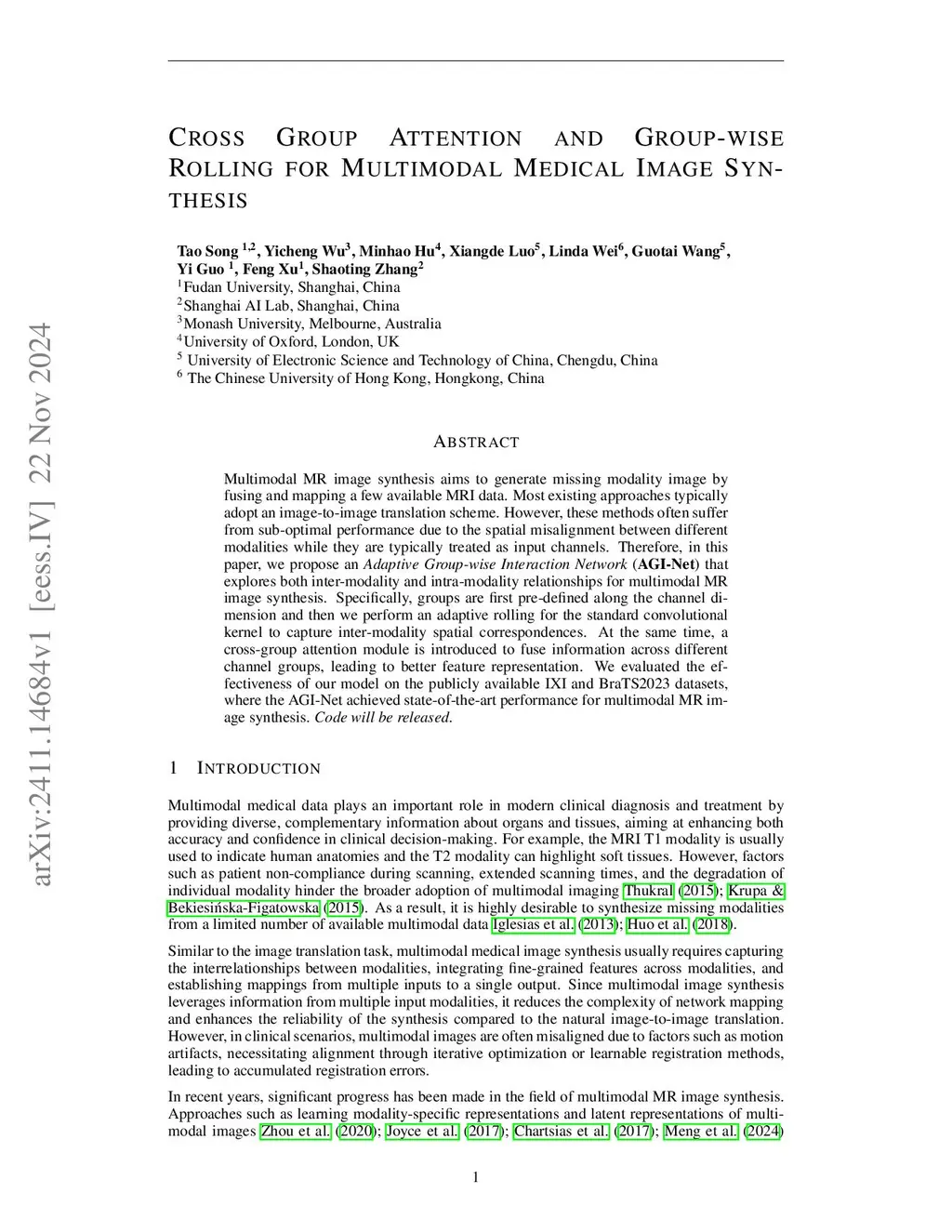 Multimodal MR image synthesis aims to generate missing modality images by effectively fusing and mapping from a subset of available MRI modalities. Most existing methods adopt an image-to-image translation paradigm, treating multiple modalities as input channels. However, these approaches often yield sub-optimal results due to the inherent difficulty in achieving precise feature- or semantic-level alignment across modalities. To address these challenges, we propose an Adaptive Group-wise Interaction Network (AGI-Net) that explicitly models both inter-modality and intra-modality relationships for multimodal MR image synthesis. Specifically, feature channels are first partitioned into predefined groups, after which an adaptive rolling mechanism is applied to conventional convolutional kernels to better capture feature and semantic correspondences between different modalities. In parallel, a cross-group attention module is introduced to enable effective feature fusion across groups, thereby enhancing the network's representational capacity. We validate the proposed AGI-Net on the publicly available IXI and BraTS2023 datasets. Experimental results demonstrate that AGI-Net achieves state-of-the-art performance in multimodal MR image synthesis tasks, confirming the effectiveness of its modality-aware interaction design. We release the relevant code at:this https URL.