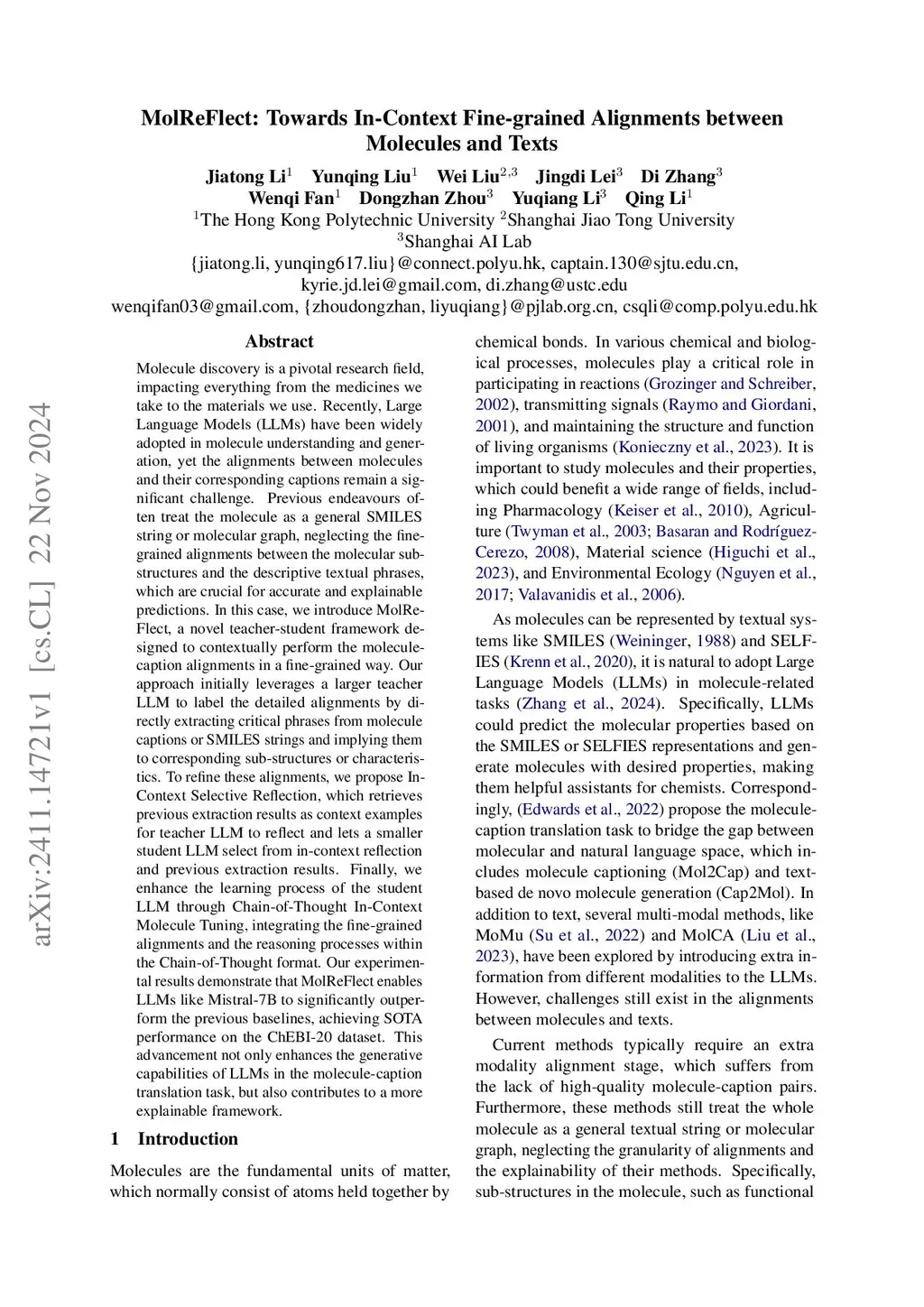 Molecule discovery is a pivotal research field, impacting everything from the medicines we take to the materials we use. Recently, Large Language Models (LLMs) have been widely adopted in molecule understanding and generation, yet the alignments between molecules and their corresponding captions remain a significant challenge. Previous endeavours often treat the molecule as a general SMILES string or molecular graph, neglecting the fine-grained alignments between the molecular sub-structures and the descriptive textual phrases, which are crucial for accurate and explainable predictions. In this case, we introduce MolReFlect, a novel teacher-student framework designed to contextually perform the molecule-caption alignments in a fine-grained way. Our approach initially leverages a larger teacher LLM to label the detailed alignments by directly extracting critical phrases from molecule captions or SMILES strings and implying them to corresponding sub-structures or characteristics. To refine these alignments, we propose In-Context Selective Reflection, which retrieves previous extraction results as context examples for teacher LLM to reflect and lets a smaller student LLM select from in-context reflection and previous extraction results. Finally, we enhance the learning process of the student LLM through Chain-of-Thought In-Context Molecule Tuning, integrating the fine-grained alignments and the reasoning processes within the Chain-of-Thought format. Our experimental results demonstrate that MolReFlect enables LLMs like Mistral-7B to significantly outperform the previous baselines, achieving SOTA performance on the ChEBI-20 dataset. This advancement not only enhances the generative capabilities of LLMs in the molecule-caption translation task, but also contributes to a more explainable framework.