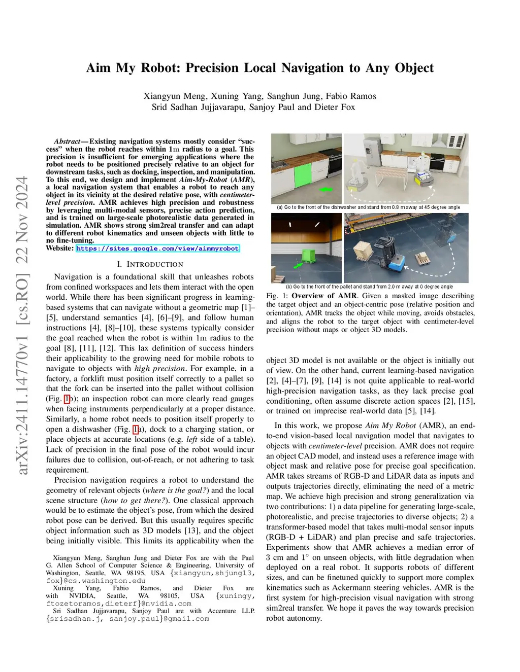Existing navigation systems mostly consider "success" when the robot reaches within 1m radius to a goal. This precision is insufficient for emerging applications where the robot needs to be positioned precisely relative to an object for downstream tasks, such as docking, inspection, and manipulation. To this end, we design and implement Aim-My-Robot (AMR), a local navigation system that enables a robot to reach any object in its vicinity at the desired relative pose, with centimeter-level precision. AMR achieves high precision and robustness by leveraging multi-modal perception, precise action prediction, and is trained on large-scale photorealistic data generated in simulation. AMR shows strong sim2real transfer and can adapt to different robot kinematics and unseen objects with little to no fine-tuning.