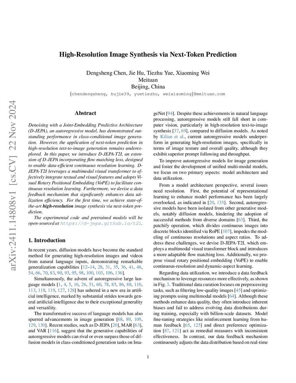 Recently, autoregressive models have demonstrated remarkable performance in class-conditional image generation. However, the application of next-token prediction to high-resolution text-to-image generation remains largely unexplored. In this paper, we introduce \textbf{D-JEPAT2I}, an autoregressive model based on continuous tokens that incorporates innovations in both architecture and training strategy to generate high-quality, photorealistic images at arbitrary resolutions, up to 4K. Architecturally, we adopt the denoising joint embedding predictive architecture (D-JEPA) while leveraging a multimodal visual transformer to effectively integrate textual and visual features. Additionally, we introduce flow matching loss alongside the proposed Visual Rotary Positional Embedding (VoPE) to enable continuous resolution learning. In terms of training strategy, we propose a data feedback mechanism that dynamically adjusts the sampling procedure based on statistical analysis and an online learning critic model. This encourages the model to move beyond its comfort zone, reducing redundant training on well-mastered scenarios and compelling it to address more challenging cases with suboptimal generation quality. For the first time, we achieve state-of-the-art high-resolution image synthesis via next-token prediction.