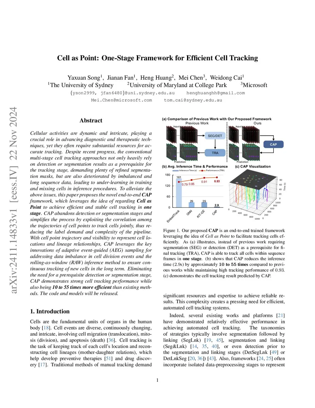 Conventional multi-stage cell tracking approaches rely heavily on detection or segmentation in each frame as a prerequisite, requiring substantial resources for high-quality segmentation masks and increasing the overall prediction time. To address these limitations, we propose CAP, a novel end-to-end one-stage framework that reimagines cell tracking by treating Cell as Point. Unlike traditional methods, CAP eliminates the need for explicit detection or segmentation, instead jointly tracking cells for sequences in one stage by leveraging the inherent correlations among their trajectories. This simplification reduces both labeling requirements and pipeline complexity. However, directly processing the entire sequence in one stage poses challenges related to data imbalance in capturing cell division events and long sequence inference. To solve these challenges, CAP introduces two key innovations: (1) adaptive event-guided (AEG) sampling, which prioritizes cell division events to mitigate the occurrence imbalance of cell events, and (2) the rolling-as-window (RAW) inference strategy, which ensures continuous and stable tracking of newly emerging cells over extended sequences. By removing the dependency on segmentation-based preprocessing while addressing the challenges of imbalanced occurrence of cell events and long-sequence tracking, CAP demonstrates promising cell tracking performance and is 8 to 32 times more efficient than existing methods. The code and model checkpoints will be available soon.