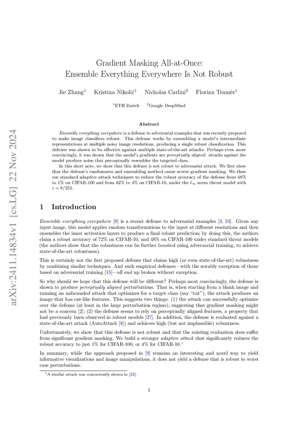 Ensemble everything everywhere is a defense to adversarial examples that was recently proposed to make image classifiers robust. This defense works by ensembling a model's intermediate representations at multiple noisy image resolutions, producing a single robust classification. This defense was shown to be effective against multiple state-of-the-art attacks. Perhaps even more convincingly, it was shown that the model's gradients are perceptually aligned: attacks against the model produce noise that perceptually resembles the targeted class.In this short note, we show that this defense is not robust to adversarial attack. We first show that the defense's randomness and ensembling method cause severe gradient masking. We then use standard adaptive attack techniques to reduce the defense's robust accuracy from 48% to 14% on CIFAR-100 and from 62% to 11% on CIFAR-10, under the -norm threat model with .