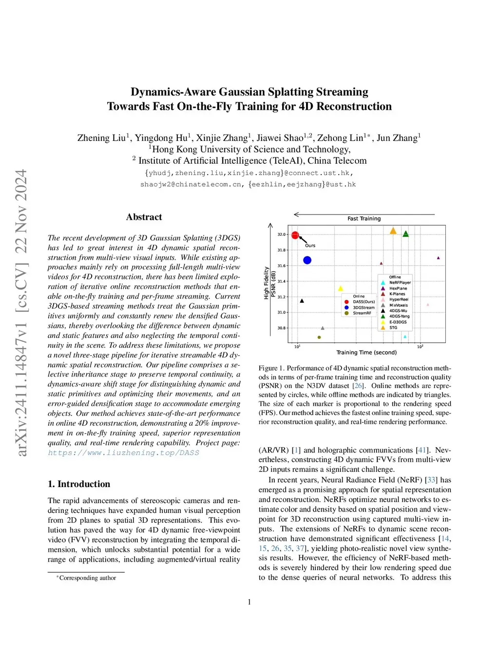 The recent development of 3D Gaussian Splatting (3DGS) has led to great interest in 4D dynamic spatial reconstruction. Existing approaches mainly rely on full-length multi-view videos, while there has been limited exploration of online reconstruction methods that enable on-the-fly training and per-timestep streaming. Current 3DGS-based streaming methods treat the Gaussian primitives uniformly and constantly renew the densified Gaussians, thereby overlooking the difference between dynamic and static features as well as neglecting the temporal continuity in the scene. To address these limitations, we propose a novel three-stage pipeline for iterative streamable 4D dynamic spatial reconstruction. Our pipeline comprises a selective inheritance stage to preserve temporal continuity, a dynamics-aware shift stage to distinguish dynamic and static primitives and optimize their movements, and an error-guided densification stage to accommodate emerging objects. Our method achieves state-of-the-art performance in online 4D reconstruction, demonstrating the fastest on-the-fly training, superior representation quality, and real-time rendering capability. Project page:this https URL