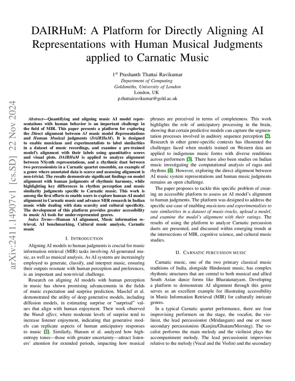 Quantifying and aligning music AI model representations with human behavior is an important challenge in the field of MIR. This paper presents a platform for exploring the Direct alignment between AI music model Representations and Human Musical judgments (DAIRHuM). It is designed to enable musicians and experimentalists to label similarities in a dataset of music recordings, and examine a pre-trained model's alignment with their labels using quantitative scores and visual plots. DAIRHuM is applied to analyze alignment between NSynth representations, and a rhythmic duet between two percussionists in a Carnatic quartet ensemble, an example of a genre where annotated data is scarce and assessing alignment is non-trivial. The results demonstrate significant findings on model alignment with human judgments of rhythmic harmony, while highlighting key differences in rhythm perception and music similarity judgments specific to Carnatic music. This work is among the first efforts to enable users to explore human-AI model alignment in Carnatic music and advance MIR research in Indian music while dealing with data scarcity and cultural specificity. The development of this platform provides greater accessibility to music AI tools for under-represented genres.