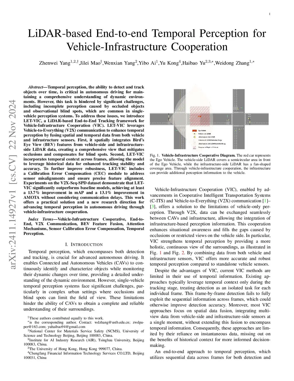 Temporal perception, defined as the capability to detect and track objects across temporal sequences, serves as a fundamental component in autonomous driving systems. While single-vehicle perception systems encounter limitations, stemming from incomplete perception due to object occlusion and inherent blind spots, cooperative perception systems present their own challenges in terms of sensor calibration precision and positioning accuracy. To address these issues, we introduce LET-VIC, a LiDAR-based End-to-End Tracking framework for Vehicle-Infrastructure Cooperation (VIC). First, we employ Temporal Self-Attention and VIC Cross-Attention modules to effectively integrate temporal and spatial information from both vehicle and infrastructure perspectives. Then, we develop a novel Calibration Error Compensation (CEC) module to mitigate sensor misalignment issues and facilitate accurate feature alignment. Experiments on the V2X-Seq-SPD dataset demonstrate that LET-VIC significantly outperforms baseline models. Compared to LET-V, LET-VIC achieves +15.0% improvement in mAP and a +17.3% improvement in AMOTA. Furthermore, LET-VIC surpasses representative Tracking by Detection models, including V2VNet, FFNet, and PointPillars, with at least a +13.7% improvement in mAP and a +13.1% improvement in AMOTA without considering communication delays, showcasing its robust detection and tracking performance. The experiments demonstrate that the integration of multi-view perspectives, temporal sequences, or CEC in end-to-end training significantly improves both detection and tracking performance. All code will be open-sourced.