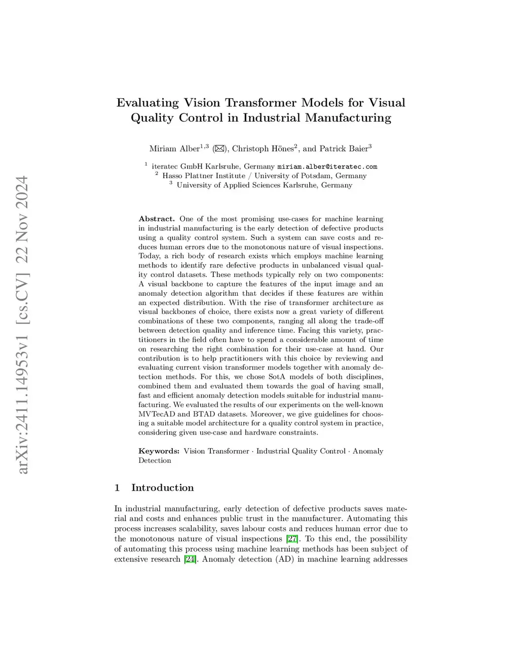 One of the most promising use-cases for machine learning in industrial manufacturing is the early detection of defective products using a quality control system. Such a system can save costs and reduces human errors due to the monotonous nature of visual inspections. Today, a rich body of research exists which employs machine learning methods to identify rare defective products in unbalanced visual quality control datasets. These methods typically rely on two components: A visual backbone to capture the features of the input image and an anomaly detection algorithm that decides if these features are within an expected distribution. With the rise of transformer architecture as visual backbones of choice, there exists now a great variety of different combinations of these two components, ranging all along the trade-off between detection quality and inference time. Facing this variety, practitioners in the field often have to spend a considerable amount of time on researching the right combination for their use-case at hand. Our contribution is to help practitioners with this choice by reviewing and evaluating current vision transformer models together with anomaly detection methods. For this, we chose SotA models of both disciplines, combined them and evaluated them towards the goal of having small, fast and efficient anomaly detection models suitable for industrial manufacturing. We evaluated the results of our experiments on the well-known MVTecAD and BTAD datasets. Moreover, we give guidelines for choosing a suitable model architecture for a quality control system in practice, considering given use-case and hardware constraints.