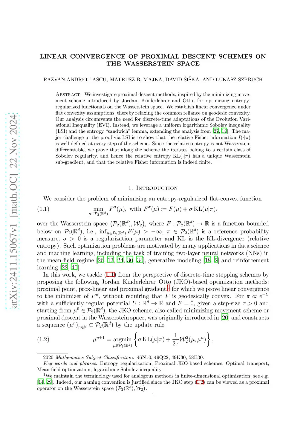 We investigate proximal descent methods, inspired by the minimizing movement scheme introduced by Jordan, Kinderlehrer and Otto, for optimizing entropy-regularized functionals on the Wasserstein space. We establish linear convergence under flat convexity assumptions, thereby relaxing the common reliance on geodesic convexity. Our analysis circumvents the need for discrete-time adaptations of the Evolution Variational Inequality (EVI). Instead, we leverage a uniform logarithmic Sobolev inequality (LSI) and the entropy "sandwich" lemma, extending the analysis from arXiv:2201.10469 and arXiv:2202.01009. The major challenge in the proof via LSI is to show that the relative Fisher information is well-defined at every step of the scheme. Since the relative entropy is not Wasserstein differentiable, we prove that along the scheme the iterates belong to a certain class of Sobolev regularity, and hence the relative entropy has a unique Wasserstein sub-gradient, and that the relative Fisher information is indeed finite.