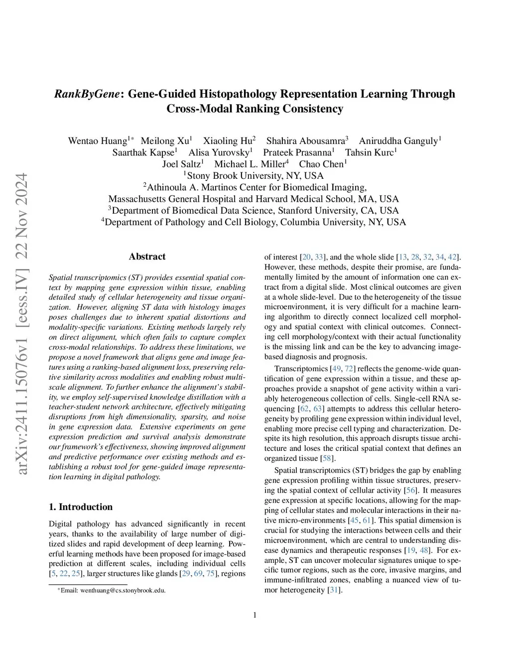 Spatial transcriptomics (ST) provides essential spatial context by mapping gene expression within tissue, enabling detailed study of cellular heterogeneity and tissue organization. However, aligning ST data with histology images poses challenges due to inherent spatial distortions and modality-specific variations. Existing methods largely rely on direct alignment, which often fails to capture complex cross-modal relationships. To address these limitations, we propose a novel framework that aligns gene and image features using a ranking-based alignment loss, preserving relative similarity across modalities and enabling robust multi-scale alignment. To further enhance the alignment's stability, we employ self-supervised knowledge distillation with a teacher-student network architecture, effectively mitigating disruptions from high dimensionality, sparsity, and noise in gene expression data. Extensive experiments on seven public datasets that encompass gene expression prediction, slide-level classification, and survival analysis demonstrate the efficacy of our method, showing improved alignment and predictive performance over existing methods.