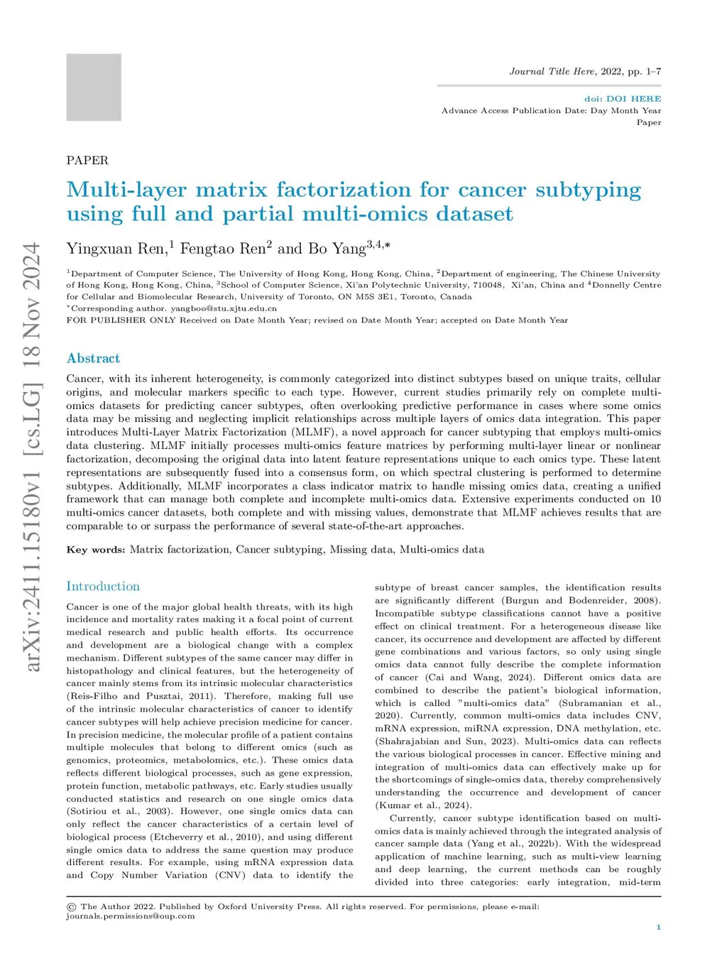Cancer, with its inherent heterogeneity, is commonly categorized into distinct subtypes based on unique traits, cellular origins, and molecular markers specific to each type. However, current studies primarily rely on complete multi-omics datasets for predicting cancer subtypes, often overlooking predictive performance in cases where some omics data may be missing and neglecting implicit relationships across multiple layers of omics data integration. This paper introduces Multi-Layer Matrix Factorization (MLMF), a novel approach for cancer subtyping that employs multi-omics data clustering. MLMF initially processes multi-omics feature matrices by performing multi-layer linear or nonlinear factorization, decomposing the original data into latent feature representations unique to each omics type. These latent representations are subsequently fused into a consensus form, on which spectral clustering is performed to determine subtypes. Additionally, MLMF incorporates a class indicator matrix to handle missing omics data, creating a unified framework that can manage both complete and incomplete multi-omics data. Extensive experiments conducted on 10 multi-omics cancer datasets, both complete and with missing values, demonstrate that MLMF achieves results that are comparable to or surpass the performance of several state-of-the-art approaches.