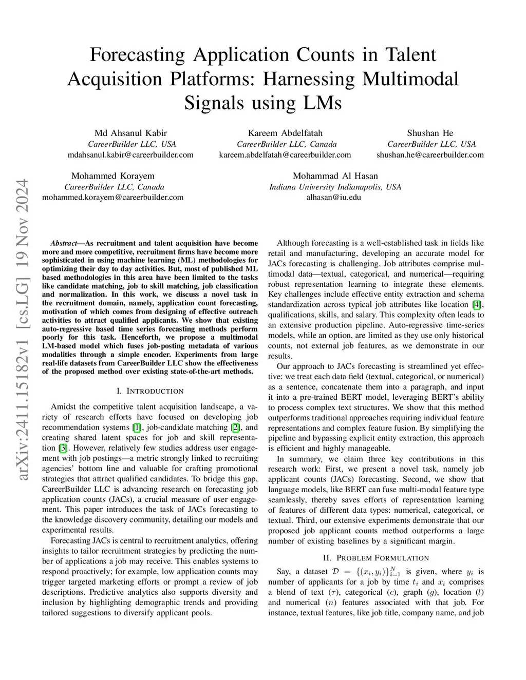As recruitment and talent acquisition have become more and more competitive, recruitment firms have become more sophisticated in using machine learning (ML) methodologies for optimizing their day to day activities. But, most of published ML based methodologies in this area have been limited to the tasks like candidate matching, job to skill matching, job classification and normalization. In this work, we discuss a novel task in the recruitment domain, namely, application count forecasting, motivation of which comes from designing of effective outreach activities to attract qualified applicants. We show that existing auto-regressive based time series forecasting methods perform poorly for this task. Henceforth, we propose a multimodal LM-based model which fuses job-posting metadata of various modalities through a simple encoder. Experiments from large real-life datasets from CareerBuilder LLC show the effectiveness of the proposed method over existing state-of-the-art methods.