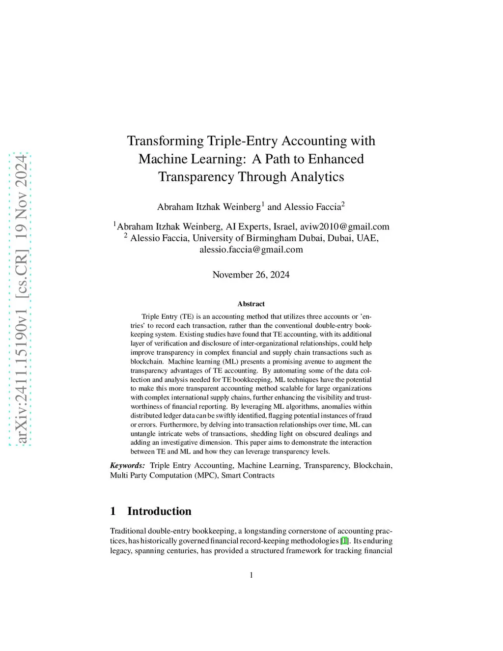 Triple Entry (TE) is an accounting method that utilizes three accounts or éntries' to record each transaction, rather than the conventional double-entry bookkeeping system. Existing studies have found that TE accounting, with its additional layer of verification and disclosure of inter-organizational relationships, could help improve transparency in complex financial and supply chain transactions such as blockchain. Machine learning (ML) presents a promising avenue to augment the transparency advantages of TE accounting. By automating some of the data collection and analysis needed for TE bookkeeping, ML techniques have the potential to make this more transparent accounting method scalable for large organizations with complex international supply chains, further enhancing the visibility and trustworthiness of financial reporting. By leveraging ML algorithms, anomalies within distributed ledger data can be swiftly identified, flagging potential instances of fraud or errors. Furthermore, by delving into transaction relationships over time, ML can untangle intricate webs of transactions, shedding light on obscured dealings and adding an investigative dimension. This paper aims to demonstrate the interaction between TE and ML and how they can leverage transparency levels.