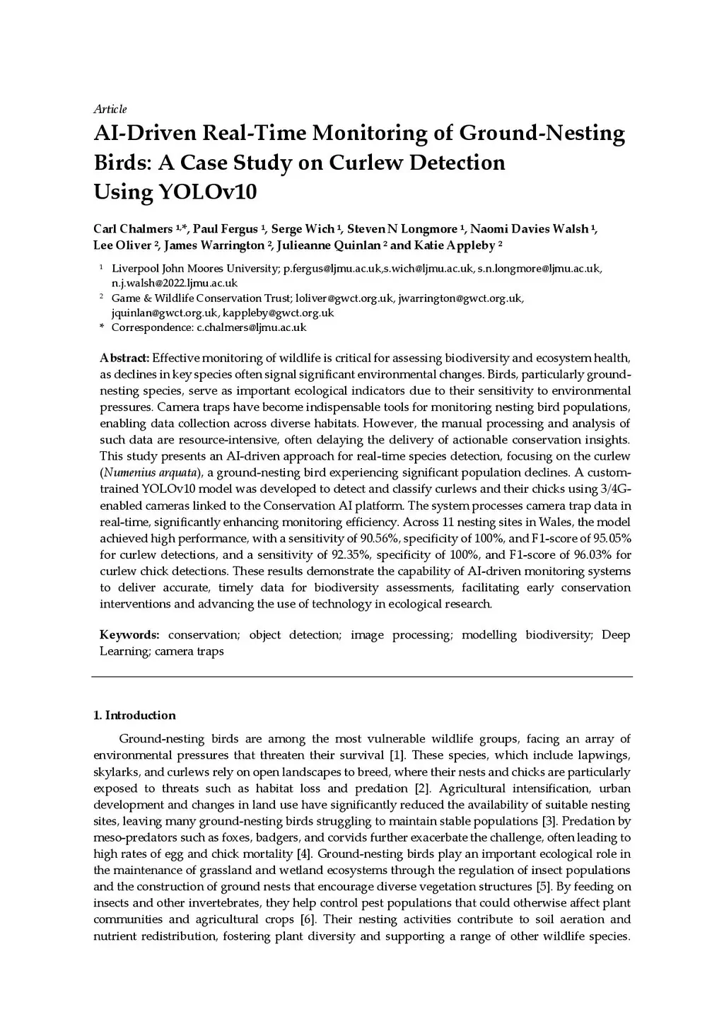 Effective monitoring of wildlife is critical for assessing biodiversity and ecosystem health, as declines in key species often signal significant environmental changes. Birds, particularly ground-nesting species, serve as important ecological indicators due to their sensitivity to environmental pressures. Camera traps have become indispensable tools for monitoring nesting bird populations, enabling data collection across diverse habitats. However, the manual processing and analysis of such data are resource-intensive, often delaying the delivery of actionable conservation insights. This study presents an AI-driven approach for real-time species detection, focusing on the curlew (Numenius arquata), a ground-nesting bird experiencing significant population declines. A custom-trained YOLOv10 model was developed to detect and classify curlews and their chicks using 3/4G-enabled cameras linked to the Conservation AI platform. The system processes camera trap data in real-time, significantly enhancing monitoring efficiency. Across 11 nesting sites in Wales, the model achieved high performance, with a sensitivity of 90.56%, specificity of 100%, and F1-score of 95.05% for curlew detections, and a sensitivity of 92.35%, specificity of 100%, and F1-score of 96.03% for curlew chick detections. These results demonstrate the capability of AI-driven monitoring systems to deliver accurate, timely data for biodiversity assessments, facilitating early conservation interventions and advancing the use of technology in ecological research.