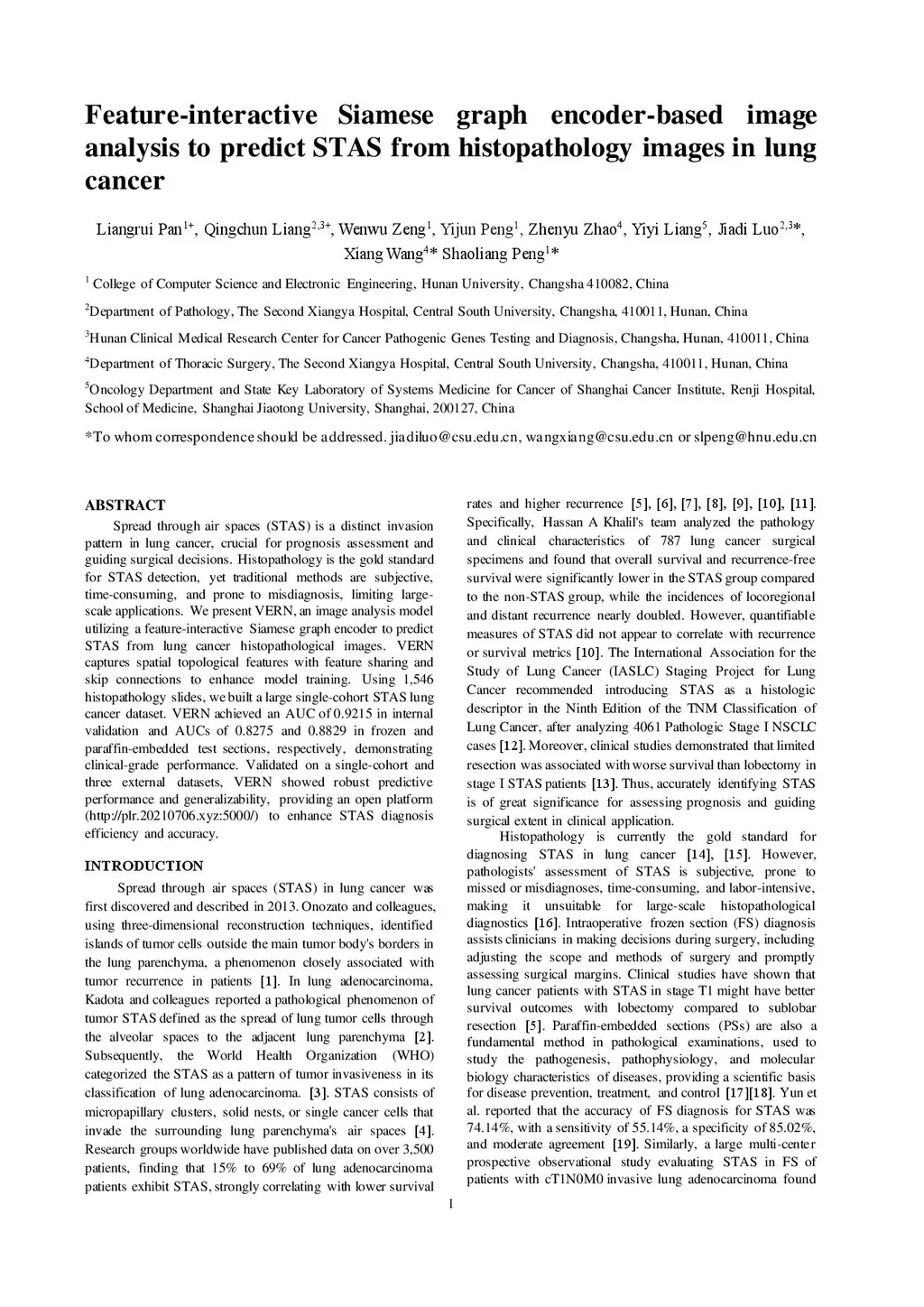 Spread through air spaces (STAS) is a distinct invasion pattern in lung cancer, crucial for prognosis assessment and guiding surgical decisions. Histopathology is the gold standard for STAS detection, yet traditional methods are subjective, time-consuming, and prone to misdiagnosis, limiting large-scale applications. We present VERN, an image analysis model utilizing a feature-interactive Siamese graph encoder to predict STAS from lung cancer histopathological images. VERN captures spatial topological features with feature sharing and skip connections to enhance model training. Using 1,546 histopathology slides, we built a large single-cohort STAS lung cancer dataset. VERN achieved an AUC of 0.9215 in internal validation and AUCs of 0.8275 and 0.8829 in frozen and paraffin-embedded test sections, respectively, demonstrating clinical-grade performance. Validated on a single-cohort and three external datasets, VERN showed robust predictive performance and generalizability, providing an open platform (http://plr.20210706.xyz:5000/) to enhance STAS diagnosis efficiency and accuracy.