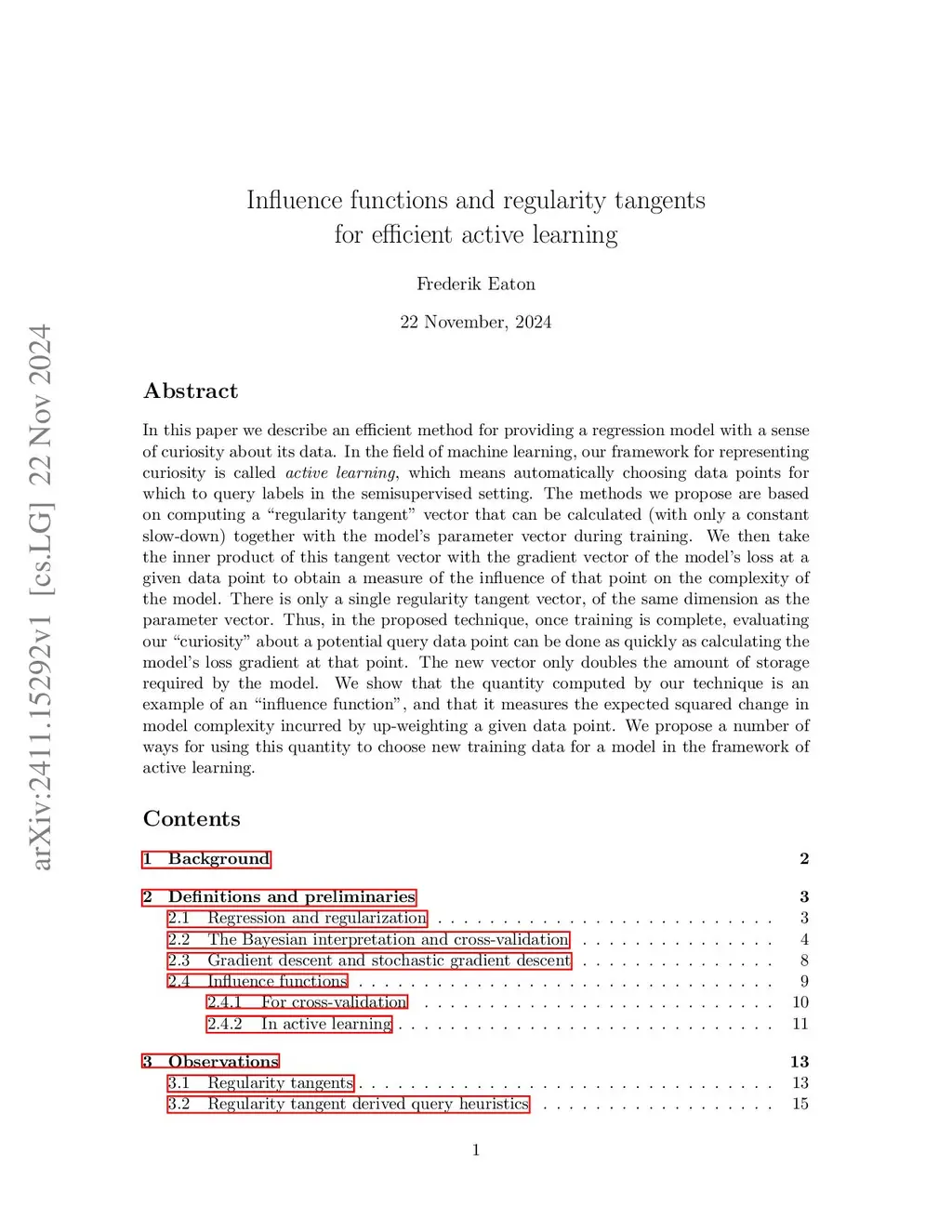In this paper we describe an efficient method for providing a regression model with a sense of curiosity about its data. In the field of machine learning, our framework for representing curiosity is called Active Learning, which concerns the problem of automatically choosing data points for which to query labels in the semi-supervised setting. The methods we propose are based on computing a "regularity tangent" vector that can be calculated (with only a constant slow-down) together with the model's parameter vector during training. We then take the inner product of this tangent vector with the gradient vector of the model's loss at a given data point to obtain a measure of the influence of that point on the complexity of the model. In the simplest instantiation, there is only a single regularity tangent vector, of the same dimension as the parameter vector. Thus, in the proposed technique, once training is complete, evaluating our "curiosity" about a potential query data point can be done as quickly as calculating the model's loss gradient at that point. The new vector only doubles the amount of storage required by the model. We show that the quantity computed by our technique is an example of an "influence function", and that it measures the expected squared change in model complexity incurred by up-weighting a given data point. We propose a number of ways for using this and other related quantities to choose new training data points for a regression model.