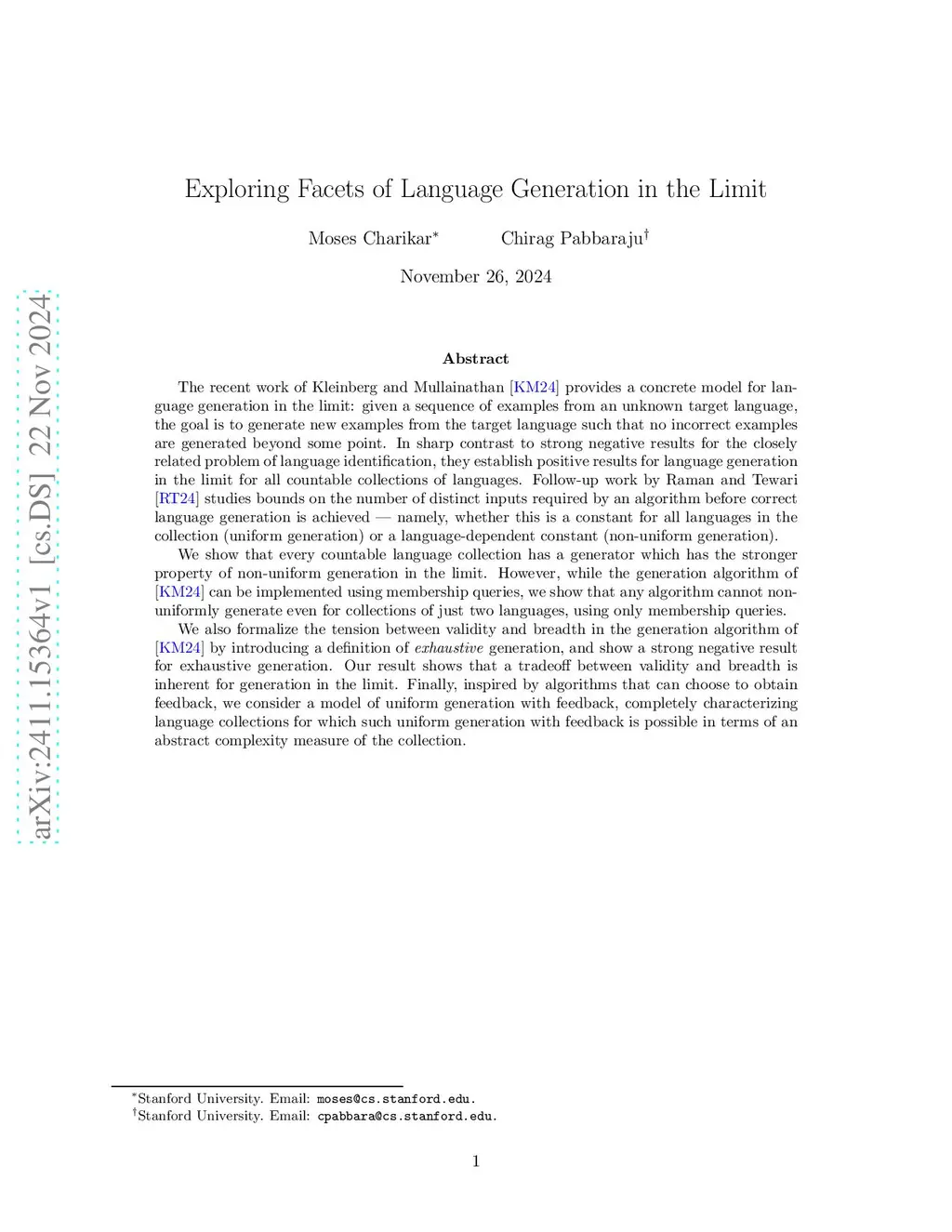 The recent work of Kleinberg & Mullainathan [KM24] provides a concrete model for language generation in the limit: given a sequence of examples from an unknown target language, the goal is to generate new examples from the target language such that no incorrect examples are generated beyond some point. In sharp contrast to strong negative results for the closely related problem of language identification, they establish positive results for language generation in the limit for all countable collections of languages. Follow-up work by Raman & Tewari [RT24] studies bounds on the number of distinct inputs required by an algorithm before correct language generation is achieved -- namely, whether this is a constant for all languages in the collection (uniform generation) or a language-dependent constant (non-uniform generation). We show that every countable language collection has a generator which has the stronger property of non-uniform generation in the limit. However, while the generation algorithm of [KM24] can be implemented using membership queries, we show that any algorithm cannot non-uniformly generate even for collections of just two languages, using only membership queries. We also formalize the tension between validity and breadth in the generation algorithm of [KM24] by introducing a definition of exhaustive generation, and show a strong negative result for exhaustive generation. Our result shows that a tradeoff between validity and breadth is inherent for generation in the limit. We also provide a precise characterization of the language collections for which exhaustive generation is possible. Finally, inspired by algorithms that can choose to obtain feedback, we consider a model of uniform generation with feedback, completely characterizing language collections for which such uniform generation with feedback is possible in terms of a complexity measure of the collection.