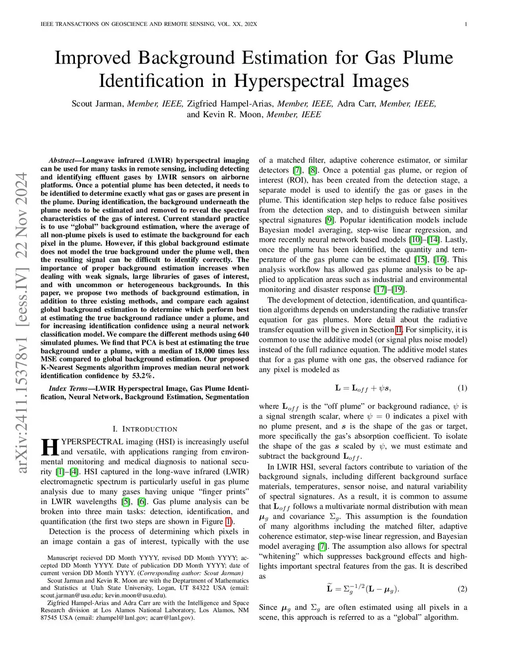 Longwave infrared (LWIR) hyperspectral imaging can be used for many tasks in remote sensing, including detecting and identifying effluent gases by LWIR sensors on airborne platforms. Once a potential plume has been detected, it needs to be identified to determine exactly what gas or gases are present in the plume. During identification, the background underneath the plume needs to be estimated and removed to reveal the spectral characteristics of the gas of interest. Current standard practice is to use ``global" background estimation, where the average of all non-plume pixels is used to estimate the background for each pixel in the plume. However, if this global background estimate does not model the true background under the plume well, then the resulting signal can be difficult to identify correctly. The importance of proper background estimation increases when dealing with weak signals, large libraries of gases of interest, and with uncommon or heterogeneous backgrounds. In this paper, we propose two methods of background estimation, in addition to three existing methods, and compare each against global background estimation to determine which perform best at estimating the true background radiance under a plume, and for increasing identification confidence using a neural network classification model. We compare the different methods using 640 simulated plumes. We find that PCA is best at estimating the true background under a plume, with a median of 18,000 times less MSE compared to global background estimation. Our proposed K-Nearest Segments algorithm improves median neural network identification confidence by 53.2%.