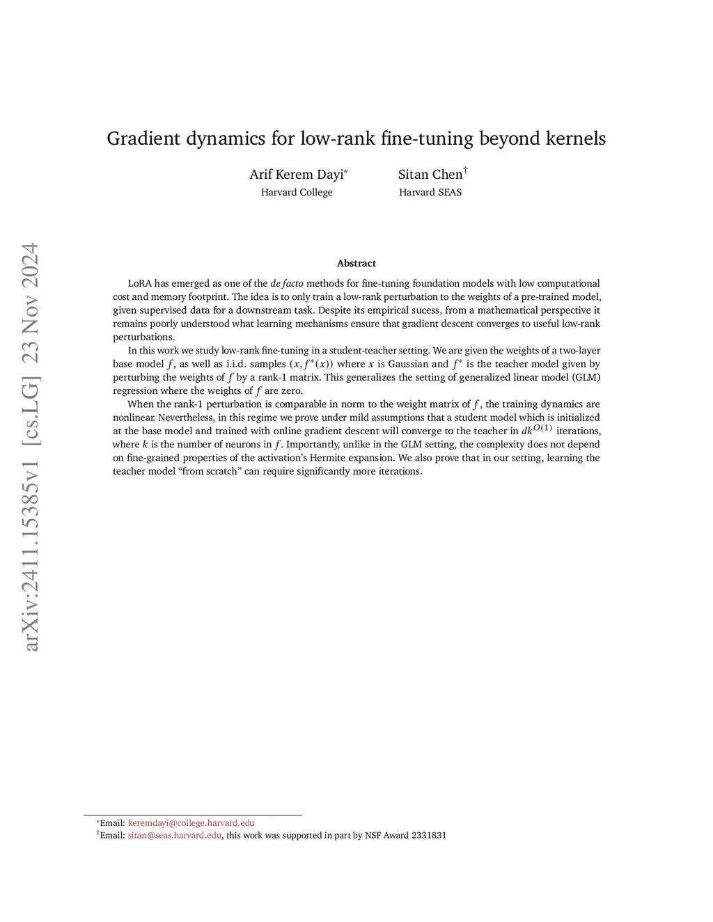LoRA has emerged as one of the de facto methods for fine-tuning foundation models with low computational cost and memory footprint. The idea is to only train a low-rank perturbation to the weights of a pre-trained model, given supervised data for a downstream task. Despite its empirical sucess, from a mathematical perspective it remains poorly understood what learning mechanisms ensure that gradient descent converges to useful low-rank perturbations. In this work we study low-rank fine-tuning in a student-teacher setting. We are given the weights of a two-layer base model , as well as i.i.d. samples where is Gaussian and is the teacher model given by perturbing the weights of by a rank-1 matrix. This generalizes the setting of generalized linear model (GLM) regression where the weights of are zero. When the rank-1 perturbation is comparable in norm to the weight matrix of , the training dynamics are nonlinear. Nevertheless, in this regime we prove under mild assumptions that a student model which is initialized at the base model and trained with online gradient descent will converge to the teacher in iterations, where is the number of neurons in . Importantly, unlike in the GLM setting, the complexity does not depend on fine-grained properties of the activation's Hermite expansion. We also prove that in our setting, learning the teacher model "from scratch'' can require significantly more iterations.