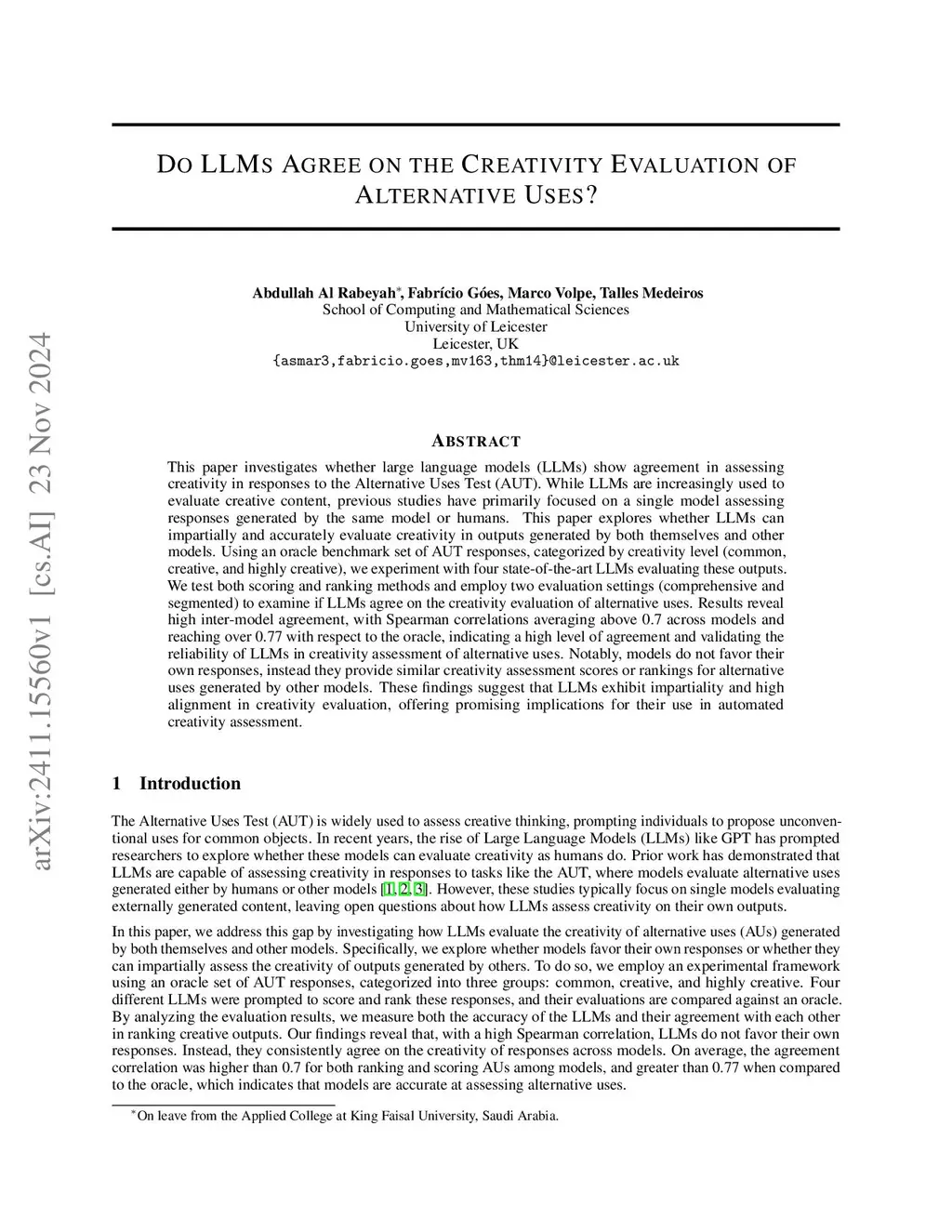 This paper investigates whether large language models (LLMs) show agreement in assessing creativity in responses to the Alternative Uses Test (AUT). While LLMs are increasingly used to evaluate creative content, previous studies have primarily focused on a single model assessing responses generated by the same model or humans. This paper explores whether LLMs can impartially and accurately evaluate creativity in outputs generated by both themselves and other models. Using an oracle benchmark set of AUT responses, categorized by creativity level (common, creative, and highly creative), we experiment with four state-of-the-art LLMs evaluating these outputs. We test both scoring and ranking methods and employ two evaluation settings (comprehensive and segmented) to examine if LLMs agree on the creativity evaluation of alternative uses. Results reveal high inter-model agreement, with Spearman correlations averaging above 0.7 across models and reaching over 0.77 with respect to the oracle, indicating a high level of agreement and validating the reliability of LLMs in creativity assessment of alternative uses. Notably, models do not favour their own responses, instead they provide similar creativity assessment scores or rankings for alternative uses generated by other models. These findings suggest that LLMs exhibit impartiality and high alignment in creativity evaluation, offering promising implications for their use in automated creativity assessment.