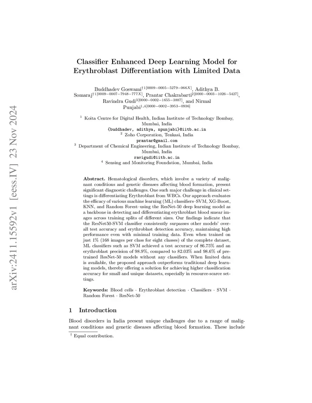 Hematological disorders, which involve a variety of malignant conditions and genetic diseases affecting blood formation, present significant diagnostic challenges. One such major challenge in clinical settings is differentiating Erythroblast from WBCs. Our approach evaluates the efficacy of various machine learning (ML) classifiersSVM, XG-Boost, KNN, and Random Forestusing the ResNet-50 deep learning model as a backbone in detecting and differentiating erythroblast blood smear images across training splits of different sizes. Our findings indicate that the ResNet50-SVM classifier consistently surpasses other models' overall test accuracy and erythroblast detection accuracy, maintaining high performance even with minimal training data. Even when trained on just 1% (168 images per class for eight classes) of the complete dataset, ML classifiers such as SVM achieved a test accuracy of 86.75% and an erythroblast precision of 98.9%, compared to 82.03% and 98.6% of pre-trained ResNet-50 models without any classifiers. When limited data is available, the proposed approach outperforms traditional deep learning models, thereby offering a solution for achieving higher classification accuracy for small and unique datasets, especially in resource-scarce settings.