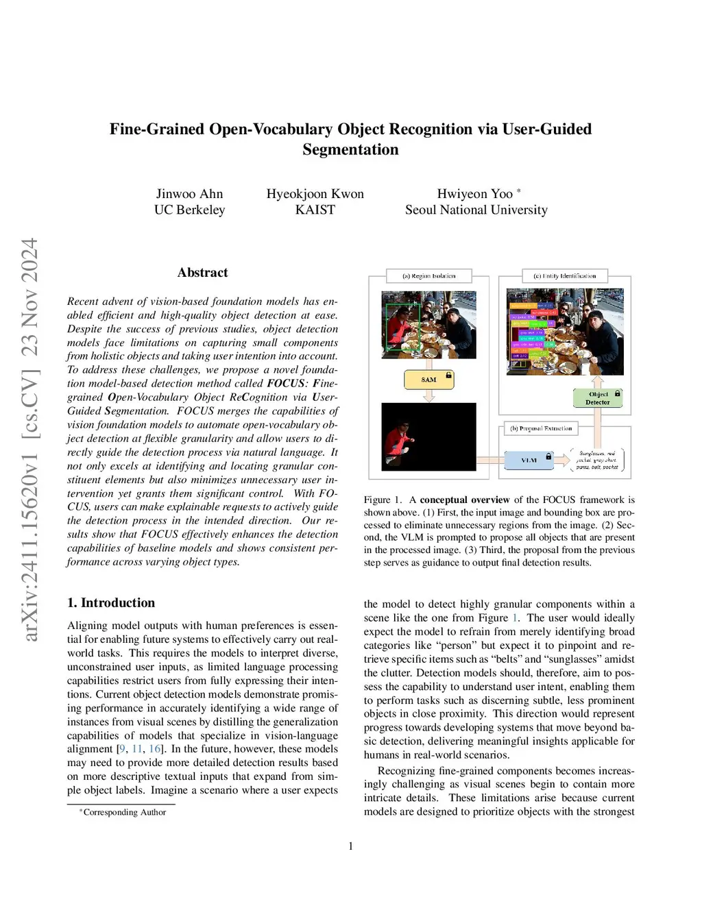 Recent advent of vision-based foundation models has enabled efficient and high-quality object detection at ease. Despite the success of previous studies, object detection models face limitations on capturing small components from holistic objects and taking user intention into account. To address these challenges, we propose a novel foundation model-based detection method called FOCUS: Fine-grained Open-Vocabulary Object ReCognition via User-Guided Segmentation. FOCUS merges the capabilities of vision foundation models to automate open-vocabulary object detection at flexible granularity and allow users to directly guide the detection process via natural language. It not only excels at identifying and locating granular constituent elements but also minimizes unnecessary user intervention yet grants them significant control. With FOCUS, users can make explainable requests to actively guide the detection process in the intended direction. Our results show that FOCUS effectively enhances the detection capabilities of baseline models and shows consistent performance across varying object types.