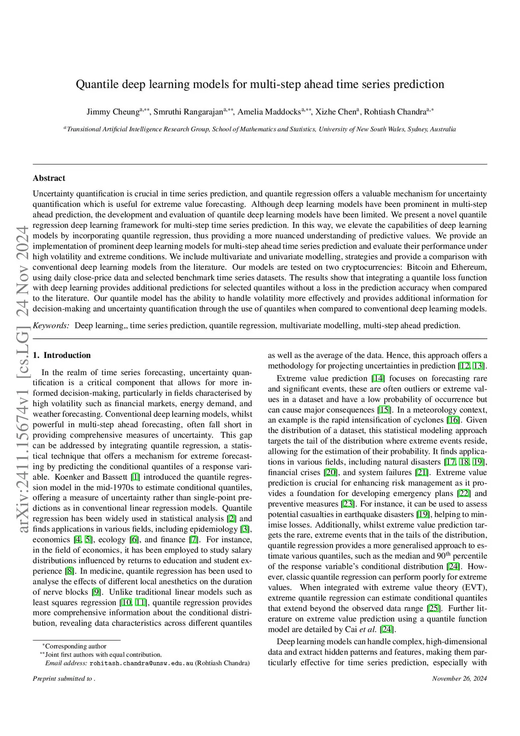 Uncertainty quantification is crucial in time series prediction, and quantile regression offers a valuable mechanism for uncertainty quantification which is useful for extreme value forecasting. Although deep learning models have been prominent in multi-step ahead prediction, the development and evaluation of quantile deep learning models have been limited. We present a novel quantile regression deep learning framework for multi-step time series prediction. In this way, we elevate the capabilities of deep learning models by incorporating quantile regression, thus providing a more nuanced understanding of predictive values. We provide an implementation of prominent deep learning models for multi-step ahead time series prediction and evaluate their performance under high volatility and extreme conditions. We include multivariate and univariate modelling, strategies and provide a comparison with conventional deep learning models from the literature. Our models are tested on two cryptocurrencies: Bitcoin and Ethereum, using daily close-price data and selected benchmark time series datasets. The results show that integrating a quantile loss function with deep learning provides additional predictions for selected quantiles without a loss in the prediction accuracy when compared to the literature. Our quantile model has the ability to handle volatility more effectively and provides additional information for decision-making and uncertainty quantification through the use of quantiles when compared to conventional deep learning models.