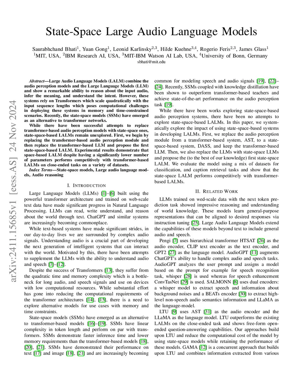 Large Audio Language Models (LALM) combine the audio perception models and the Large Language Models (LLM) and show a remarkable ability to reason about the input audio, infer the meaning, and understand the intent. However, these systems rely on Transformers which scale quadratically with the input sequence lengths which poses computational challenges in deploying these systems in memory and time-constrained scenarios. Recently, the state-space models (SSMs) have emerged as an alternative to transformer networks. While there have been successful attempts to replace transformer-based audio perception models with state-space ones, state-space-based LALMs remain unexplored. First, we begin by replacing the transformer-based audio perception module and then replace the transformer-based LLM and propose the first state-space-based LALM. Experimental results demonstrate that space-based LALM despite having a significantly lower number of parameters performs competitively with transformer-based LALMs on close-ended tasks on a variety of datasets.