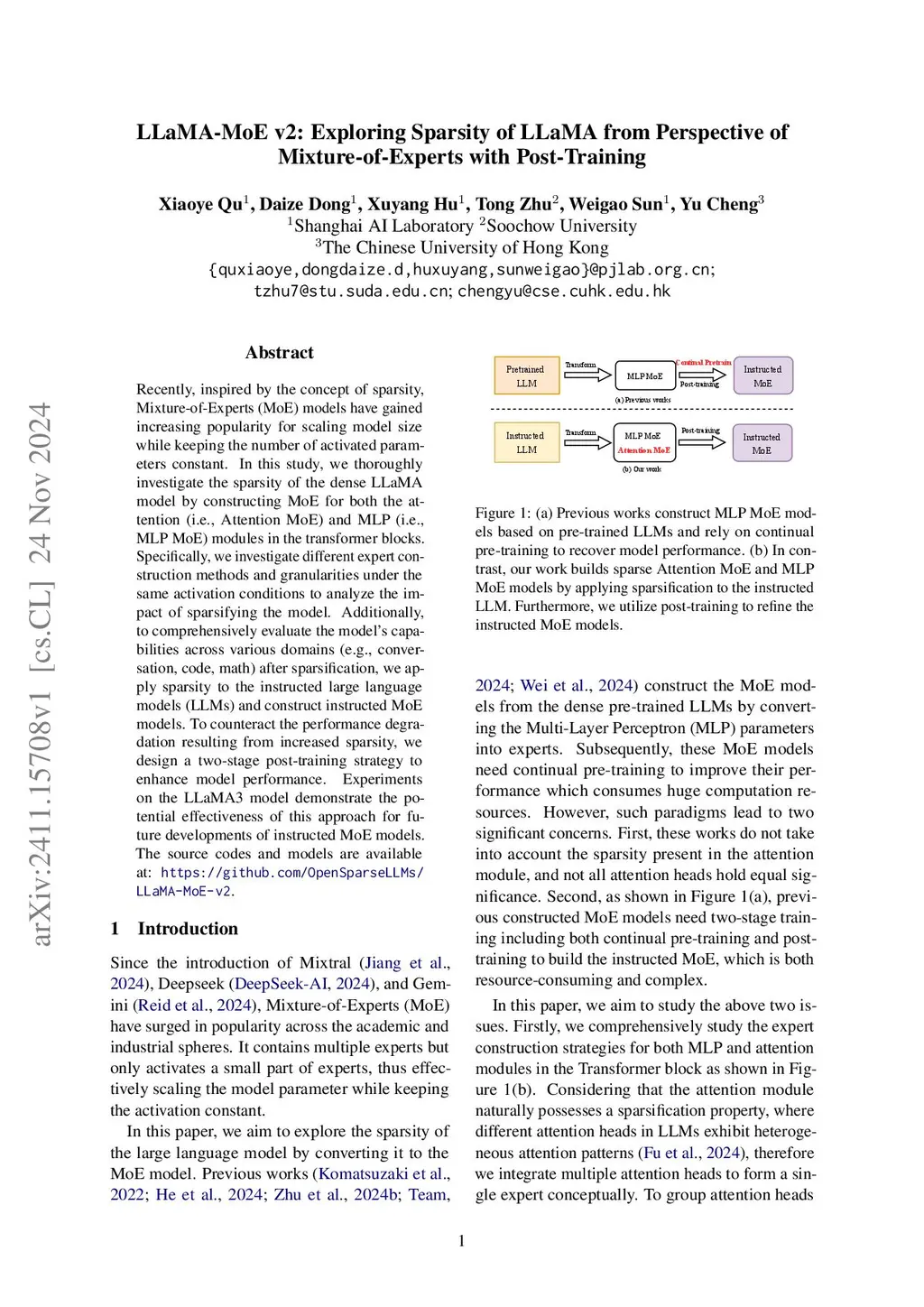 Recently, inspired by the concept of sparsity, Mixture-of-Experts (MoE) models have gained increasing popularity for scaling model size while keeping the number of activated parameters constant. In this study, we thoroughly investigate the sparsity of the dense LLaMA model by constructing MoE for both the attention (i.e., Attention MoE) and MLP (i.e., MLP MoE) modules in the transformer blocks. Specifically, we investigate different expert construction methods and granularities under the same activation conditions to analyze the impact of sparsifying the model. Additionally, to comprehensively evaluate the model's capabilities across various domains (e.g., conversation, code, math) after sparsification, we apply sparsity to the instructed large language models (LLMs) and construct instructed MoE models. To counteract the performance degradation resulting from increased sparsity, we design a two-stage post-training strategy to enhance model performance. Experiments on the LLaMA3 model demonstrate the potential effectiveness of this approach for future developments of instructed MoE models. The source codes and models are available at: \url{https://github.com/OpenSparseLLMs/LLaMA-MoE-v2}.