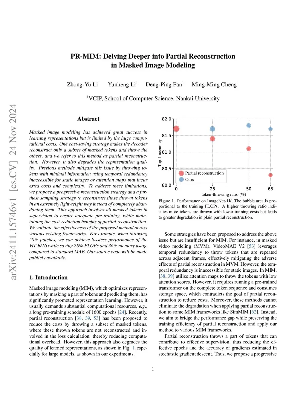 Masked image modeling has achieved great success in learning representations but is limited by the huge computational costs. One cost-saving strategy makes the decoder reconstruct only a subset of masked tokens and throw the others, and we refer to this method as partial reconstruction. However, it also degrades the representation quality. Previous methods mitigate this issue by throwing tokens with minimal information using temporal redundancy inaccessible for static images or attention maps that incur extra costs and complexity. To address these limitations, we propose a progressive reconstruction strategy and a furthest sampling strategy to reconstruct those thrown tokens in an extremely lightweight way instead of completely abandoning them. This approach involves all masked tokens in supervision to ensure adequate pre-training, while maintaining the cost-reduction benefits of partial reconstruction. We validate the effectiveness of the proposed method across various existing frameworks. For example, when throwing 50% patches, we can achieve lossless performance of the ViT-B/16 while saving 28% FLOPs and 36% memory usage compared to standard MAE. Our source code will be made publicly available