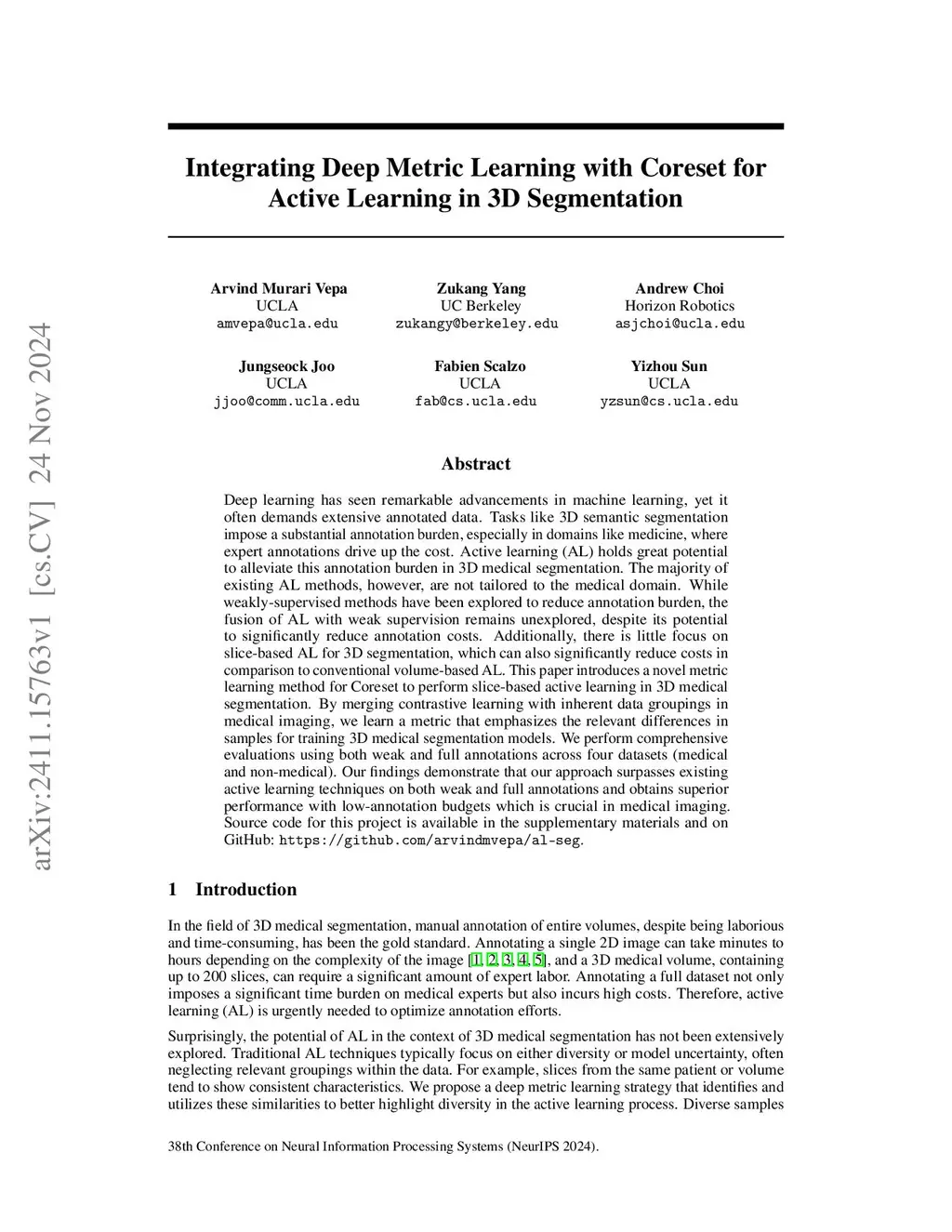 Deep learning has seen remarkable advancements in machine learning, yet it often demands extensive annotated data. Tasks like 3D semantic segmentation impose a substantial annotation burden, especially in domains like medicine, where expert annotations drive up the cost. Active learning (AL) holds great potential to alleviate this annotation burden in 3D medical segmentation. The majority of existing AL methods, however, are not tailored to the medical domain. While weakly-supervised methods have been explored to reduce annotation burden, the fusion of AL with weak supervision remains unexplored, despite its potential to significantly reduce annotation costs. Additionally, there is little focus on slice-based AL for 3D segmentation, which can also significantly reduce costs in comparison to conventional volume-based AL. This paper introduces a novel metric learning method for Coreset to perform slice-based active learning in 3D medical segmentation. By merging contrastive learning with inherent data groupings in medical imaging, we learn a metric that emphasizes the relevant differences in samples for training 3D medical segmentation models. We perform comprehensive evaluations using both weak and full annotations across four datasets (medical and non-medical). Our findings demonstrate that our approach surpasses existing active learning techniques on both weak and full annotations and obtains superior performance with low-annotation budgets which is crucial in medical imaging. Source code for this project is available in the supplementary materials and on GitHub: https://github.com/arvindmvepa/al-seg.