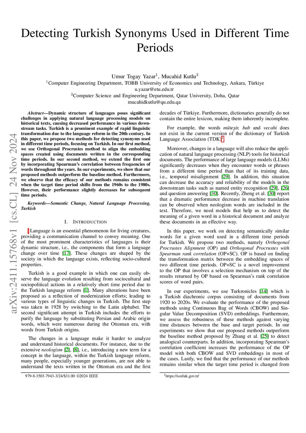 Dynamic structure of languages poses significant challenges in applying natural language processing models on historical texts, causing decreased performance in various downstream tasks. Turkish is a prominent example of rapid linguistic transformation due to the language reform in the 20th century. In this paper, we propose two methods for detecting synonyms used in different time periods, focusing on Turkish. In our first method, we use Orthogonal Procrustes method to align the embedding spaces created using documents written in the corresponding time periods. In our second method, we extend the first one by incorporating Spearman's correlation between frequencies of words throughout the years. In our experiments, we show that our proposed methods outperform the baseline method. Furthermore, we observe that the efficacy of our methods remains consistent when the target time period shifts from the 1960s to the 1980s. However, their performance slightly decreases for subsequent time periods.