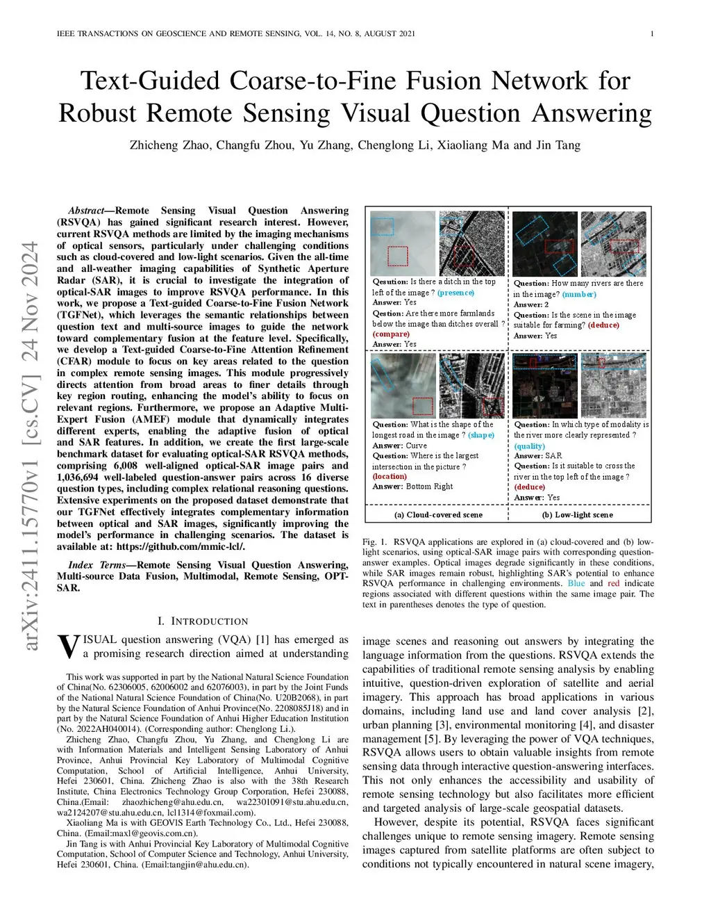 Remote Sensing Visual Question Answering (RSVQA) has gained significant research interest. However, current RSVQA methods are limited by the imaging mechanisms of optical sensors, particularly under challenging conditions such as cloud-covered and low-light scenarios. Given the all-time and all-weather imaging capabilities of Synthetic Aperture Radar (SAR), it is crucial to investigate the integration of optical-SAR images to improve RSVQA performance. In this work, we propose a Text-guided Coarse-to-Fine Fusion Network (TGFNet), which leverages the semantic relationships between question text and multi-source images to guide the network toward complementary fusion at the feature level. Specifically, we develop a Text-guided Coarse-to-Fine Attention Refinement (CFAR) module to focus on key areas related to the question in complex remote sensing images. This module progressively directs attention from broad areas to finer details through key region routing, enhancing the model's ability to focus on relevant regions. Furthermore, we propose an Adaptive Multi-Expert Fusion (AMEF) module that dynamically integrates different experts, enabling the adaptive fusion of optical and SAR features. In addition, we create the first large-scale benchmark dataset for evaluating optical-SAR RSVQA methods, comprising 6,008 well-aligned optical-SAR image pairs and 1,036,694 well-labeled question-answer pairs across 16 diverse question types, including complex relational reasoning questions. Extensive experiments on the proposed dataset demonstrate that our TGFNet effectively integrates complementary information between optical and SAR images, significantly improving the model's performance in challenging scenarios. The dataset is available at:this https URL.Index Terms: Remote Sensing Visual Question Answering, Multi-source Data Fusion, Multimodal, Remote Sensing, OPT-SAR.