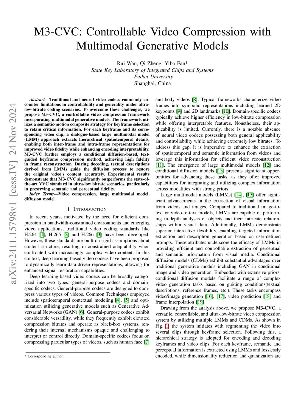Traditional and neural video codecs commonly encounter limitations in controllability and generality under ultra-low-bitrate coding scenarios. To overcome these challenges, we propose M3-CVC, a controllable video compression framework incorporating multimodal generative models. The framework utilizes a semantic-motion composite strategy for keyframe selection to retain critical information. For each keyframe and its corresponding video clip, a dialogue-based large multimodal model (LMM) approach extracts hierarchical spatiotemporal details, enabling both inter-frame and intra-frame representations for improved video fidelity while enhancing encoding interpretability. M3-CVC further employs a conditional diffusion-based, text-guided keyframe compression method, achieving high fidelity in frame reconstruction. During decoding, textual descriptions derived from LMMs guide the diffusion process to restore the original video's content accurately. Experimental results demonstrate that M3-CVC significantly outperforms the state-of-the-art VVC standard in ultra-low bitrate scenarios, particularly in preserving semantic and perceptual fidelity.