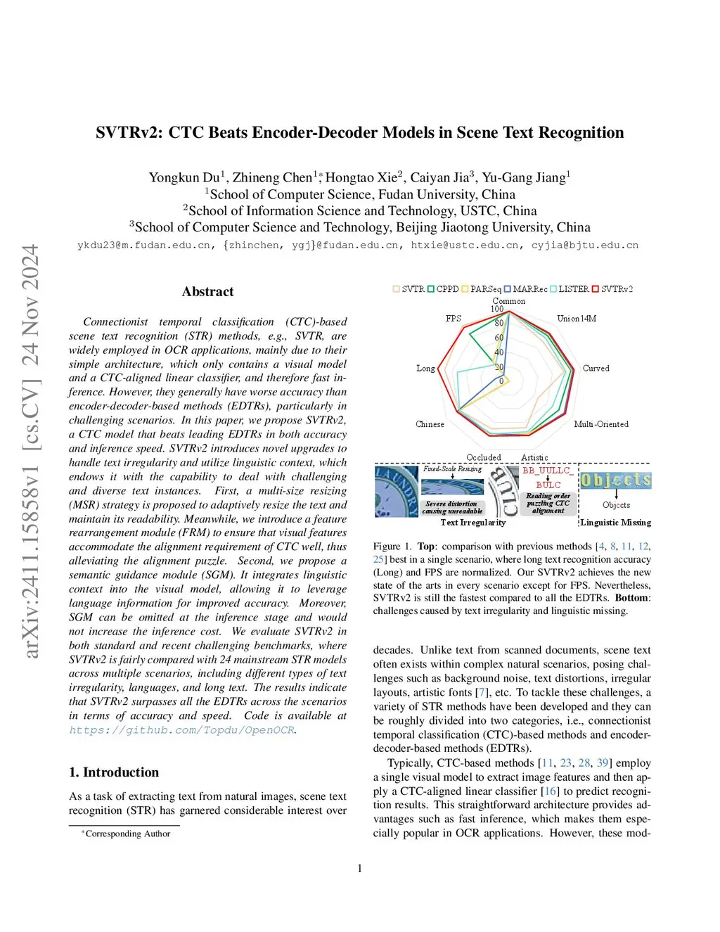 Connectionist temporal classification (CTC)-based scene text recognition (STR) methods, e.g., SVTR, are widely employed in OCR applications, mainly due to their simple architecture, which only contains a visual model and a CTC-aligned linear classifier, and therefore fast inference. However, they generally exhibit worse accuracy than encoder-decoder-based methods (EDTRs) due to struggling with text irregularity and linguistic missing. To address these challenges, we propose SVTRv2, a CTC model endowed with the ability to handle text irregularities and model linguistic context. First, a multi-size resizing strategy is proposed to resize text instances to appropriate predefined sizes, effectively avoiding severe text distortion. Meanwhile, we introduce a feature rearrangement module to ensure that visual features accommodate the requirement of CTC, thus alleviating the alignment puzzle. Second, we propose a semantic guidance module. It integrates linguistic context into the visual features, allowing CTC model to leverage language information for accuracy improvement. This module can be omitted at the inference stage and would not increase the time cost. We extensively evaluate SVTRv2 in both standard and recent challenging benchmarks, where SVTRv2 is fairly compared to popular STR models across multiple scenarios, including different types of text irregularity, languages, long text, and whether employing pretraining. SVTRv2 surpasses most EDTRs across the scenarios in terms of accuracy and inference speed. Code:this https URL.