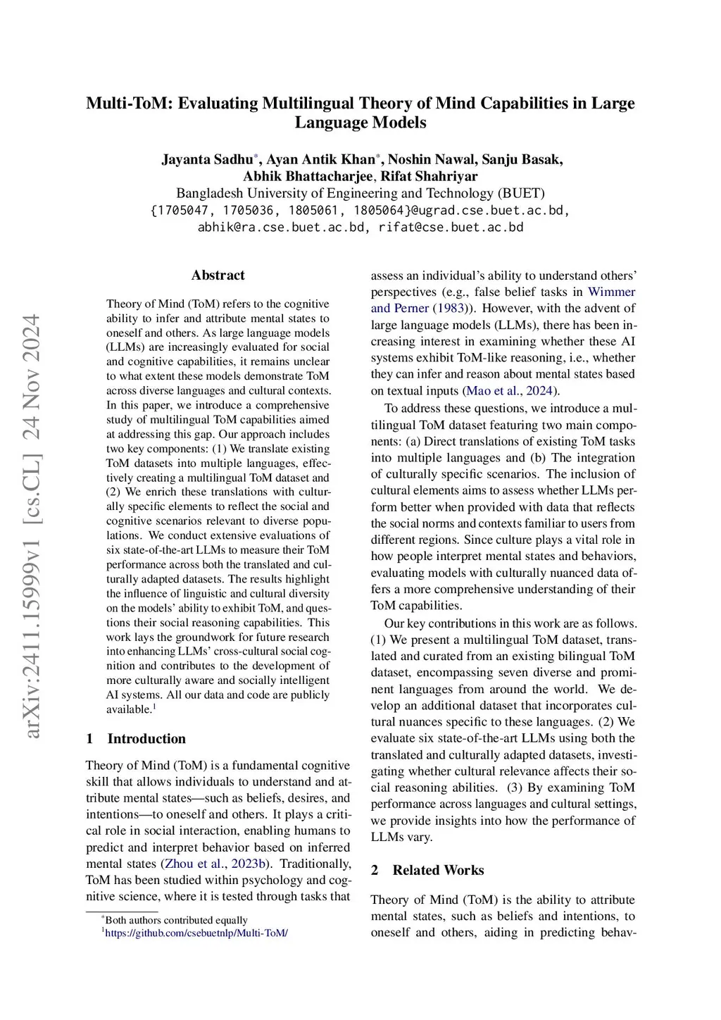 Multi-ToM: Evaluating Multilingual Theory of Mind Capabilities in Large