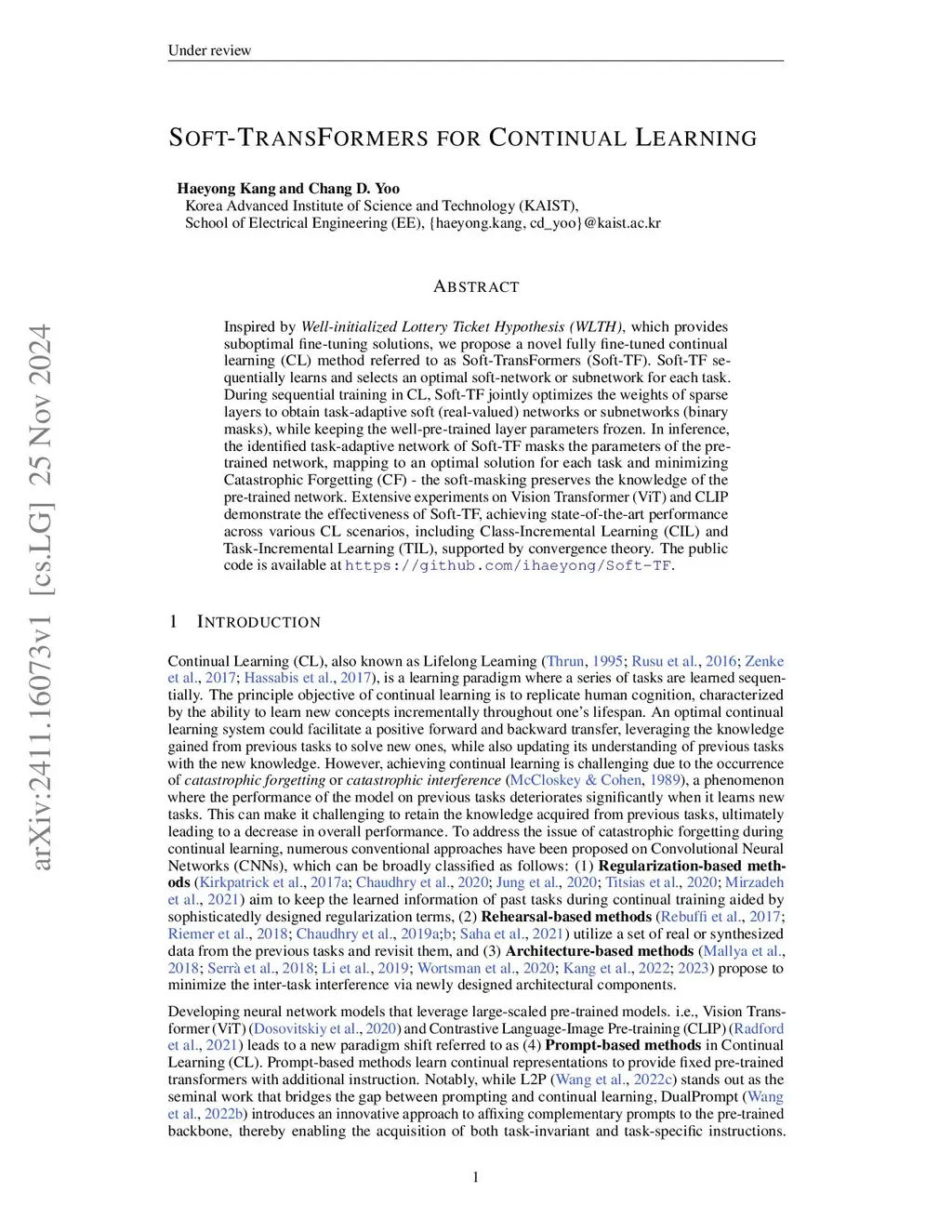 Inspired by the Well-initialized Lottery Ticket Hypothesis (WLTH), which provides suboptimal fine-tuning solutions, we propose a novel fully fine-tuned continual learning (CL) method referred to as Soft-TransFormers (Soft-TF). Soft-TF sequentially learns and selects an optimal soft-network for each task. During sequential training in CL, a well-initialized Soft-TF mask optimizes the weights of sparse layers to obtain task-adaptive soft (real-valued) networks, while keeping the well-pre-trained layer parameters frozen. In inference, the identified task-adaptive network of Soft-TF masks the parameters of the pre-trained network, mapping to an optimal solution for each task and minimizing Catastrophic Forgetting (CF) - the soft-masking preserves the knowledge of the pre-trained network. Extensive experiments on the Vision Transformer (ViT) and the Language Transformer (Bert) demonstrate the effectiveness of Soft-TF, achieving state-of-the-art performance across Vision and Language Class Incremental Learning (CIL) scenarios.