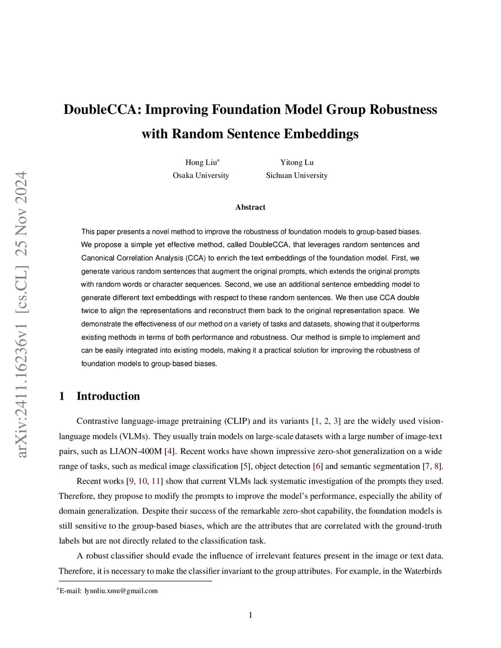 This paper presents a novel method to improve the robustness of foundation models to group-based biases. We propose a simple yet effective method, called DoubleCCA, that leverages random sentences and Canonical Correlation Analysis (CCA) to enrich the text embeddings of the foundation model. First, we generate various random sentences that augment the original prompts, which extends the original prompts with random words or character sequences. Second, we use an additional sentence embedding model to generate different text embeddings with respect to these random sentences. We then use CCA double twice to align the representations and reconstruct them back to the original representation space. We demonstrate the effectiveness of our method on a variety of tasks and datasets, showing that it outperforms existing methods in terms of both performance and robustness. Our method is simple to implement and can be easily integrated into existing models, making it a practical solution for improving the robustness of foundation models to group-based biases.