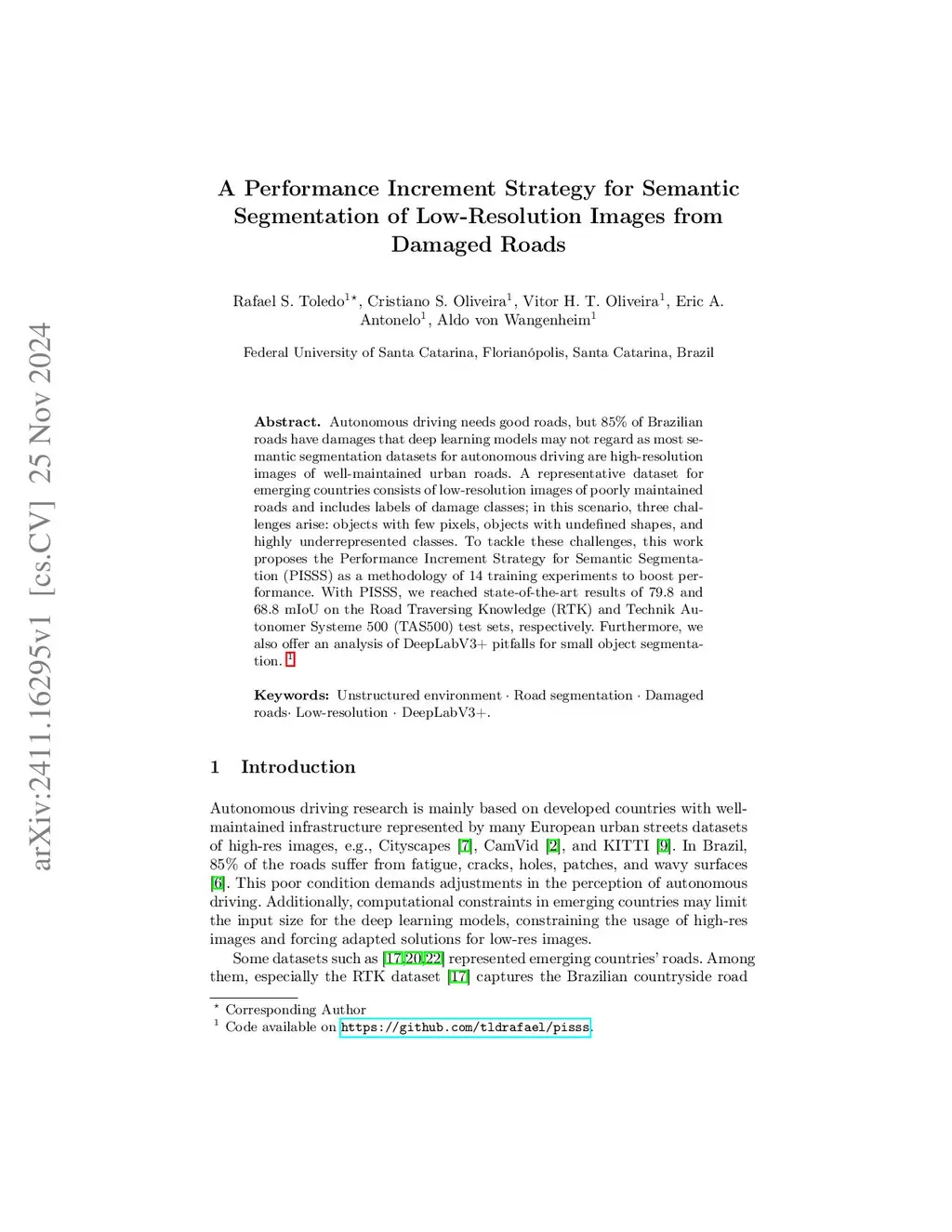 Autonomous driving needs good roads, but 85% of Brazilian roads have damages that deep learning models may not regard as most semantic segmentation datasets for autonomous driving are high-resolution images of well-maintained urban roads. A representative dataset for emerging countries consists of low-resolution images of poorly maintained roads and includes labels of damage classes; in this scenario, three challenges arise: objects with few pixels, objects with undefined shapes, and highly underrepresented classes. To tackle these challenges, this work proposes the Performance Increment Strategy for Semantic Segmentation (PISSS) as a methodology of 14 training experiments to boost performance. With PISSS, we reached state-of-the-art results of 79.8 and 68.8 mIoU on the Road Traversing Knowledge (RTK) and Technik Autonomer Systeme 500 (TAS500) test sets, respectively. Furthermore, we also offer an analysis of DeepLabV3+ pitfalls for small object segmentation.
