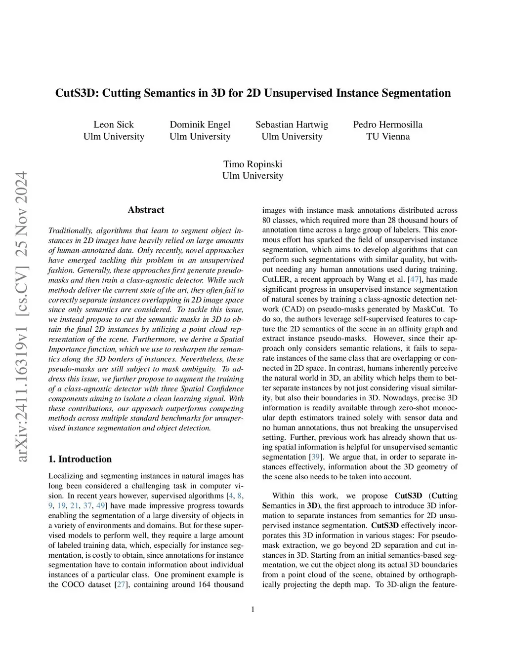 Traditionally, algorithms that learn to segment object instances in 2D images have heavily relied on large amounts of human-annotated data. Only recently, novel approaches have emerged tackling this problem in an unsupervised fashion. Generally, these approaches first generate pseudo-masks and then train a class-agnostic detector. While such methods deliver the current state of the art, they often fail to correctly separate instances overlapping in 2D image space since only semantics are considered. To tackle this issue, we instead propose to cut the semantic masks in 3D to obtain the final 2D instances by utilizing a point cloud representation of the scene. Furthermore, we derive a Spatial Importance function, which we use to resharpen the semantics along the 3D borders of instances. Nevertheless, these pseudo-masks are still subject to mask ambiguity. To address this issue, we further propose to augment the training of a class-agnostic detector with three Spatial Confidence components aiming to isolate a clean learning signal. With these contributions, our approach outperforms competing methods across multiple standard benchmarks for unsupervised instance segmentation and object detection.