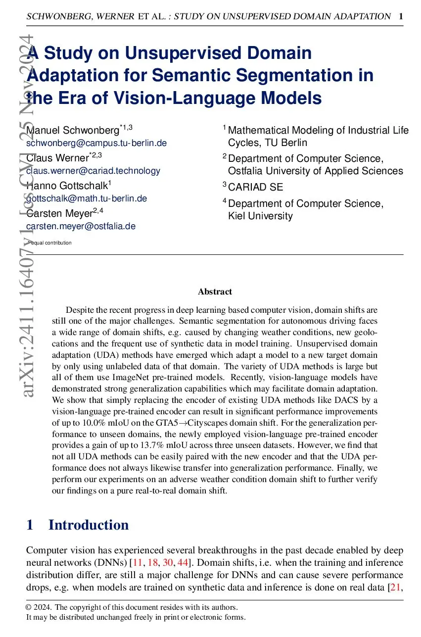 Despite the recent progress in deep learning based computer vision, domain shifts are still one of the major challenges. Semantic segmentation for autonomous driving faces a wide range of domain shifts, e.g. caused by changing weather conditions, new geolocations and the frequent use of synthetic data in model training. Unsupervised domain adaptation (UDA) methods have emerged which adapt a model to a new target domain by only using unlabeled data of that domain. The variety of UDA methods is large but all of them use ImageNet pre-trained models. Recently, vision-language models have demonstrated strong generalization capabilities which may facilitate domain adaptation. We show that simply replacing the encoder of existing UDA methods like DACS by a vision-language pre-trained encoder can result in significant performance improvements of up to 10.0% mIoU on the GTA5-to-Cityscapes domain shift. For the generalization performance to unseen domains, the newly employed vision-language pre-trained encoder provides a gain of up to 13.7% mIoU across three unseen datasets. However, we find that not all UDA methods can be easily paired with the new encoder and that the UDA performance does not always likewise transfer into generalization performance. Finally, we perform our experiments on an adverse weather condition domain shift to further verify our findings on a pure real-to-real domain shift.