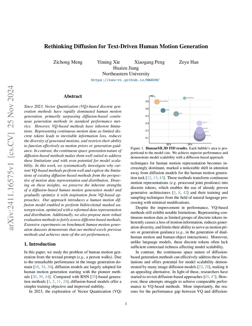 Since 2023, Vector Quantization (VQ)-based discrete generation methods have rapidly dominated human motion generation, primarily surpassing diffusion-based continuous generation methods in standard performance metrics. However, VQ-based methods have inherent limitations. Representing continuous motion data as limited discrete tokens leads to inevitable information loss, reduces the diversity of generated motions, and restricts their ability to function effectively as motion priors or generation guidance. In contrast, the continuous space generation nature of diffusion-based methods makes them well-suited to address these limitations and with even potential for model scalability. In this work, we systematically investigate why current VQ-based methods perform well and explore the limitations of existing diffusion-based methods from the perspective of motion data representation and distribution. Drawing on these insights, we preserve the inherent strengths of a diffusion-based human motion generation model and gradually optimize it with inspiration from VQ-based approaches. Our approach introduces a human motion diffusion model enabled to perform masked autoregression, optimized with a reformed data representation and distribution. Additionally, we propose a more robust evaluation method to assess different approaches. Extensive experiments on various datasets demonstrate our method outperforms previous methods and achieves state-of-the-art performances.