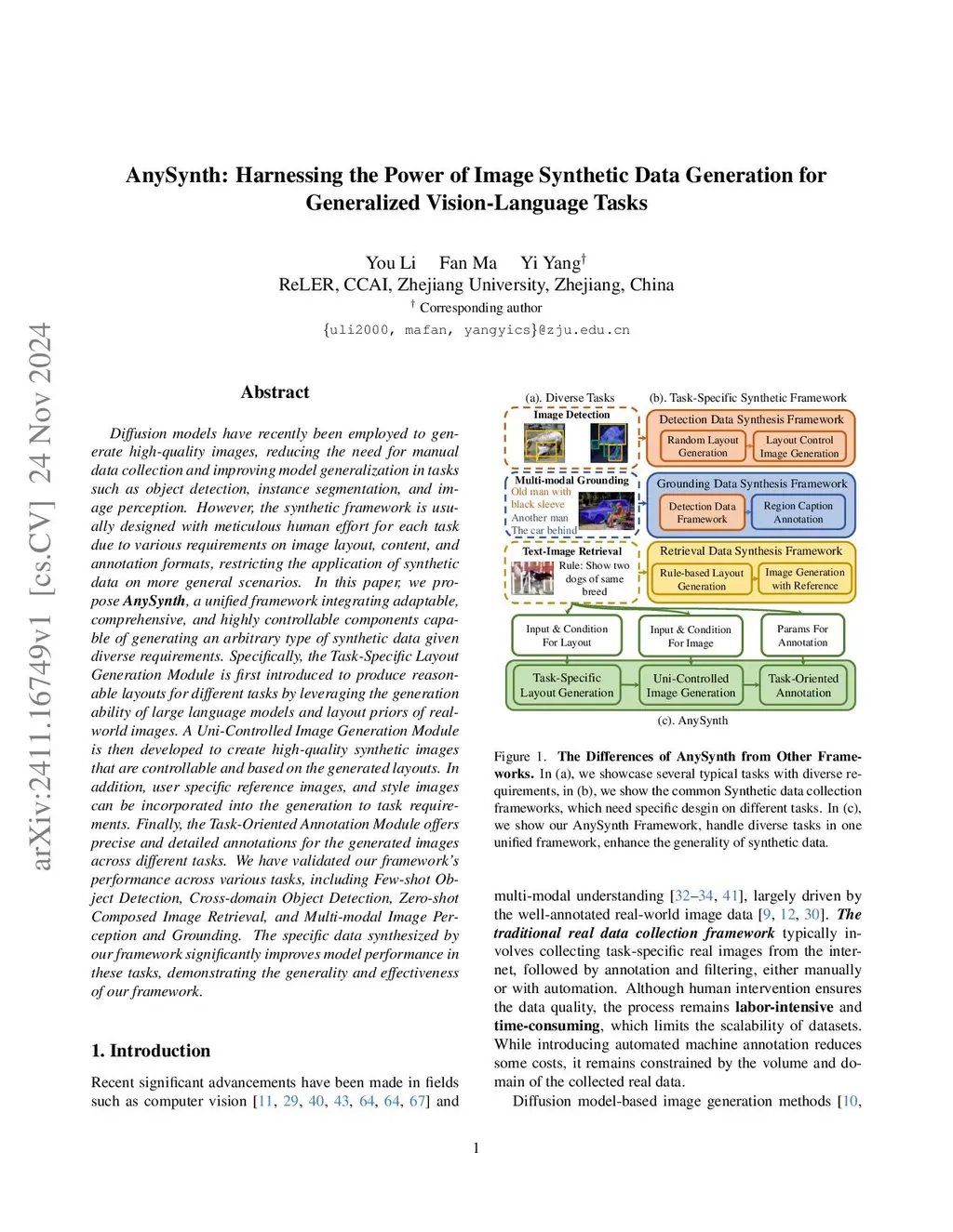 Diffusion models have recently been employed to generate high-quality images, reducing the need for manual data collection and improving model generalization in tasks such as object detection, instance segmentation, and image perception. However, the synthetic framework is usually designed with meticulous human effort for each task due to various requirements on image layout, content, and annotation formats, restricting the application of synthetic data on more general scenarios. In this paper, we propose AnySynth, a unified framework integrating adaptable, comprehensive, and highly controllable components capable of generating an arbitrary type of synthetic data given diverse requirements. Specifically, the Task-Specific Layout Generation Module is first introduced to produce reasonable layouts for different tasks by leveraging the generation ability of large language models and layout priors of real-world images. A Uni-Controlled Image Generation Module is then developed to create high-quality synthetic images that are controllable and based on the generated layouts. In addition, user specific reference images, and style images can be incorporated into the generation to task requirements. Finally, the Task-Oriented Annotation Module offers precise and detailed annotations for the generated images across different tasks. We have validated our framework's performance across various tasks, including Few-shot Object Detection, Cross-domain Object Detection, Zero-shot Composed Image Retrieval, and Multi-modal Image Perception and Grounding. The specific data synthesized by our framework significantly improves model performance in these tasks, demonstrating the generality and effectiveness of our framework.