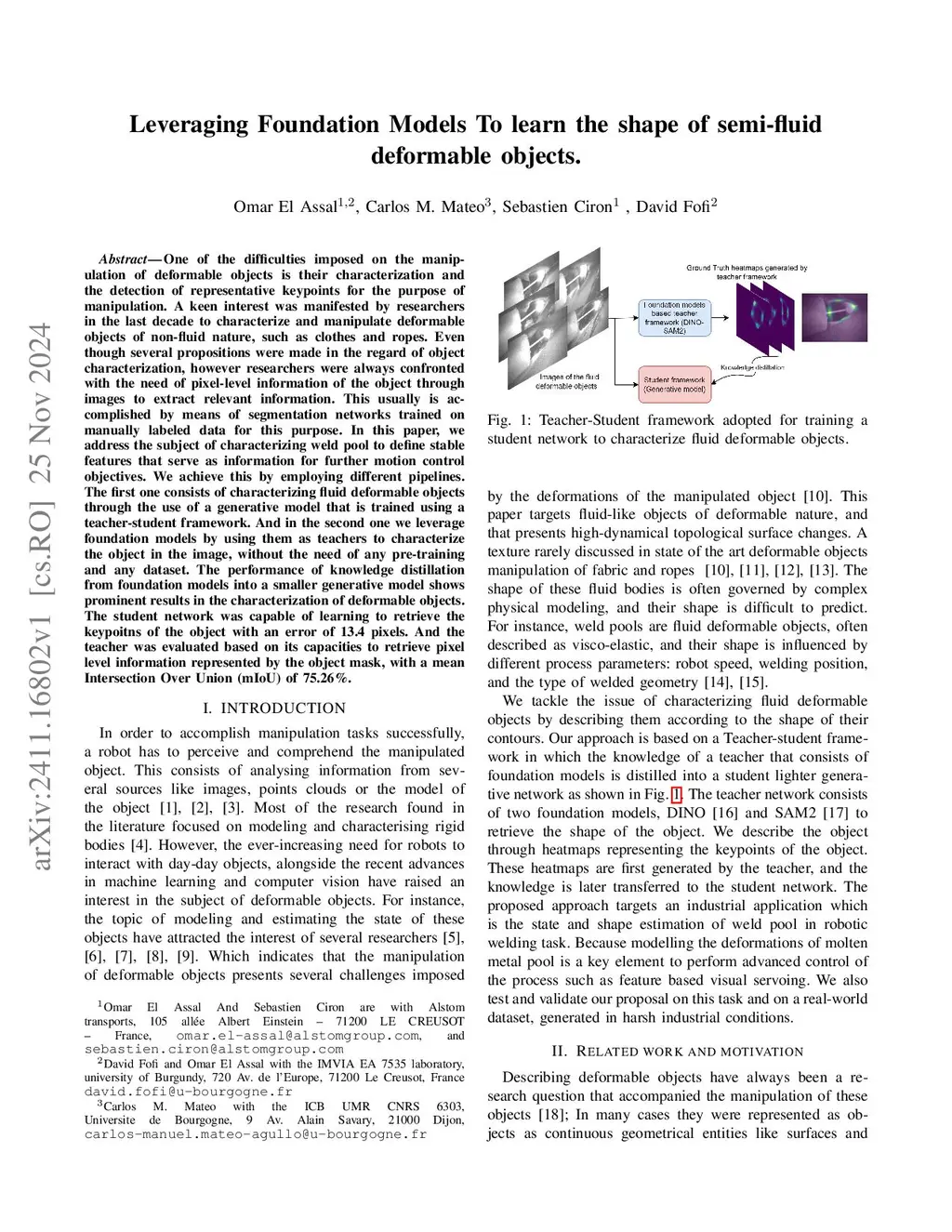 One of the difficulties imposed on the manipulation of deformable objects is their characterization and the detection of representative keypoints for the purpose of manipulation. A keen interest was manifested by researchers in the last decade to characterize and manipulate deformable objects of non-fluid nature, such as clothes and ropes. Even though several propositions were made in the regard of object characterization, however researchers were always confronted with the need of pixel-level information of the object through images to extract relevant information. This usually is accomplished by means of segmentation networks trained on manually labeled data for this purpose. In this paper, we address the subject of characterizing weld pool to define stable features that serve as information for further motion control objectives. We achieve this by employing different pipelines. The first one consists of characterizing fluid deformable objects through the use of a generative model that is trained using a teacher-student framework. And in the second one we leverage foundation models by using them as teachers to characterize the object in the image, without the need of any pre-training and any dataset. The performance of knowledge distillation from foundation models into a smaller generative model shows prominent results in the characterization of deformable objects. The student network was capable of learning to retrieve the keypoitns of the object with an error of 13.4 pixels. And the teacher was evaluated based on its capacities to retrieve pixel level information represented by the object mask, with a mean Intersection Over Union (mIoU) of 75.26%.