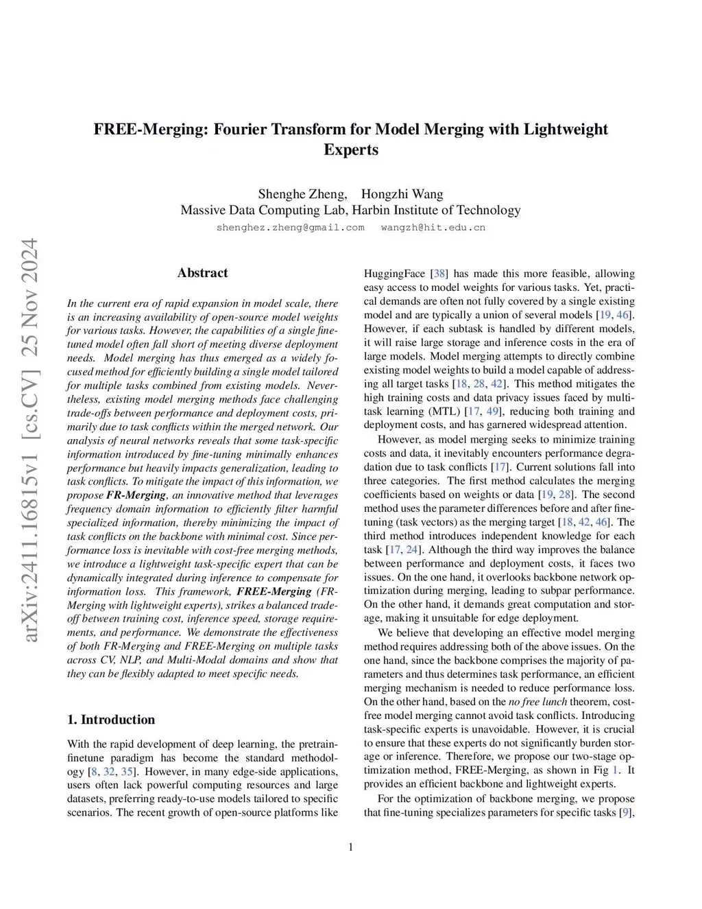With the rapid growth of deep learning, there is an increasing availability of open-source models for various tasks. However, single fine-tuned models often fall short of meeting the diverse needs of users. Model merging has thus emerged as an efficient method to integrate the capabilities of existing models into a unified model. Nevertheless, existing model merging methods face challenging trade-offs between performance and deployment costs, primarily due to task interference. For the first time, we reveal that task interference is evident in the frequency domain of model parameters, yet current efforts only focus on spatial domain solutions, which are largely ineffective in addressing frequency domain interference. To mitigate the impact of frequency domain interference, we propose FR-Merging, an innovative method that effectively filters harmful frequency domain interference on the backbone with minimal computational overhead. Since performance loss is inevitable with cost-free methods, we propose a lightweight task-specific expert module that dynamically compensates for information loss during merging. This proposed framework, FREE-Merging (FR-Merging with experts), strikes a balanced trade-off between training cost, inference latency, storage requirements, and performance. We demonstrate the effectiveness of both FR-Merging and FREE-Merging on multiple tasks across CV, NLP, and Multi-Modal domains and show that they can be flexibly adapted to specific needs.