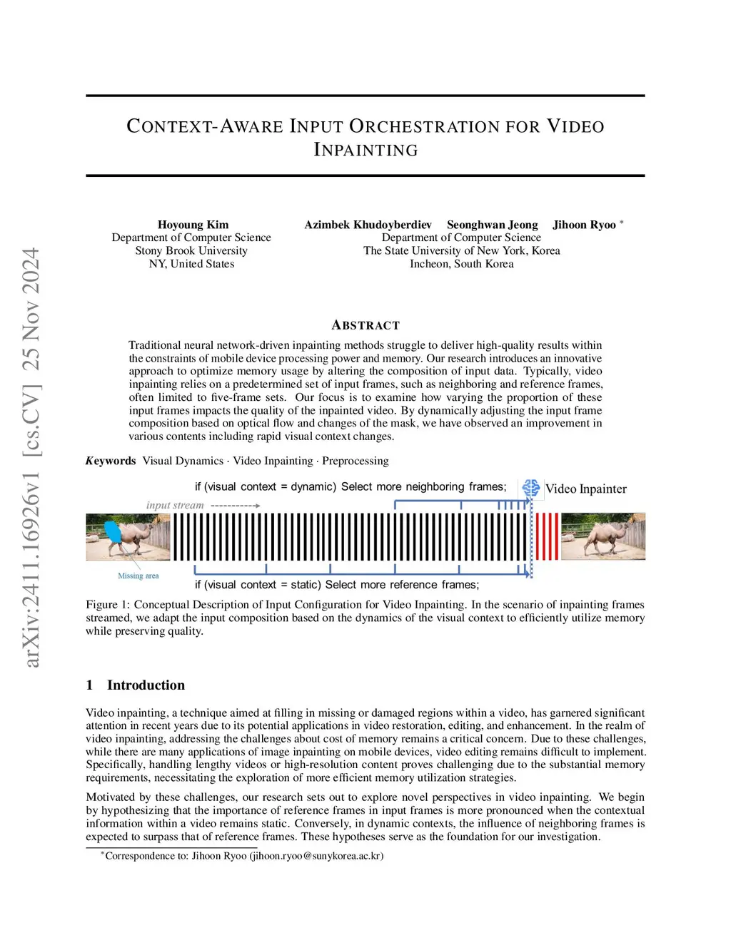 Traditional neural network-driven inpainting methods struggle to deliver high-quality results within the constraints of mobile device processing power and memory. Our research introduces an innovative approach to optimize memory usage by altering the composition of input data. Typically, video inpainting relies on a predetermined set of input frames, such as neighboring and reference frames, often limited to five-frame sets. Our focus is to examine how varying the proportion of these input frames impacts the quality of the inpainted video. By dynamically adjusting the input frame composition based on optical flow and changes of the mask, we have observed an improvement in various contents including rapid visual context changes.