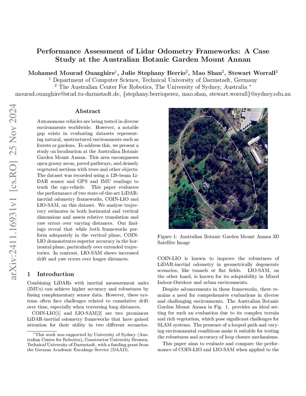 Autonomous vehicles are being tested in diverse environments worldwide. However, a notable gap exists in evaluating datasets representing natural, unstructured environments such as forests or gardens. To address this, we present a study on localisation at the Australian Botanic Garden Mount Annan. This area encompasses open grassy areas, paved pathways, and densely vegetated sections with trees and other objects. The dataset was recorded using a 128-beam LiDAR sensor and GPS and IMU readings to track the ego-vehicle. This paper evaluates the performance of two state-of-the-art LiDARinertial odometry frameworks, COIN-LIO and LIO-SAM, on this dataset. We analyse trajectory estimates in both horizontal and vertical dimensions and assess relative translation and yaw errors over varying distances. Our findings reveal that while both frameworks perform adequately in the vertical plane, COINLIO demonstrates superior accuracy in the horizontal plane, particularly over extended trajectories. In contrast, LIO-SAM shows increased drift and yaw errors over longer distances.