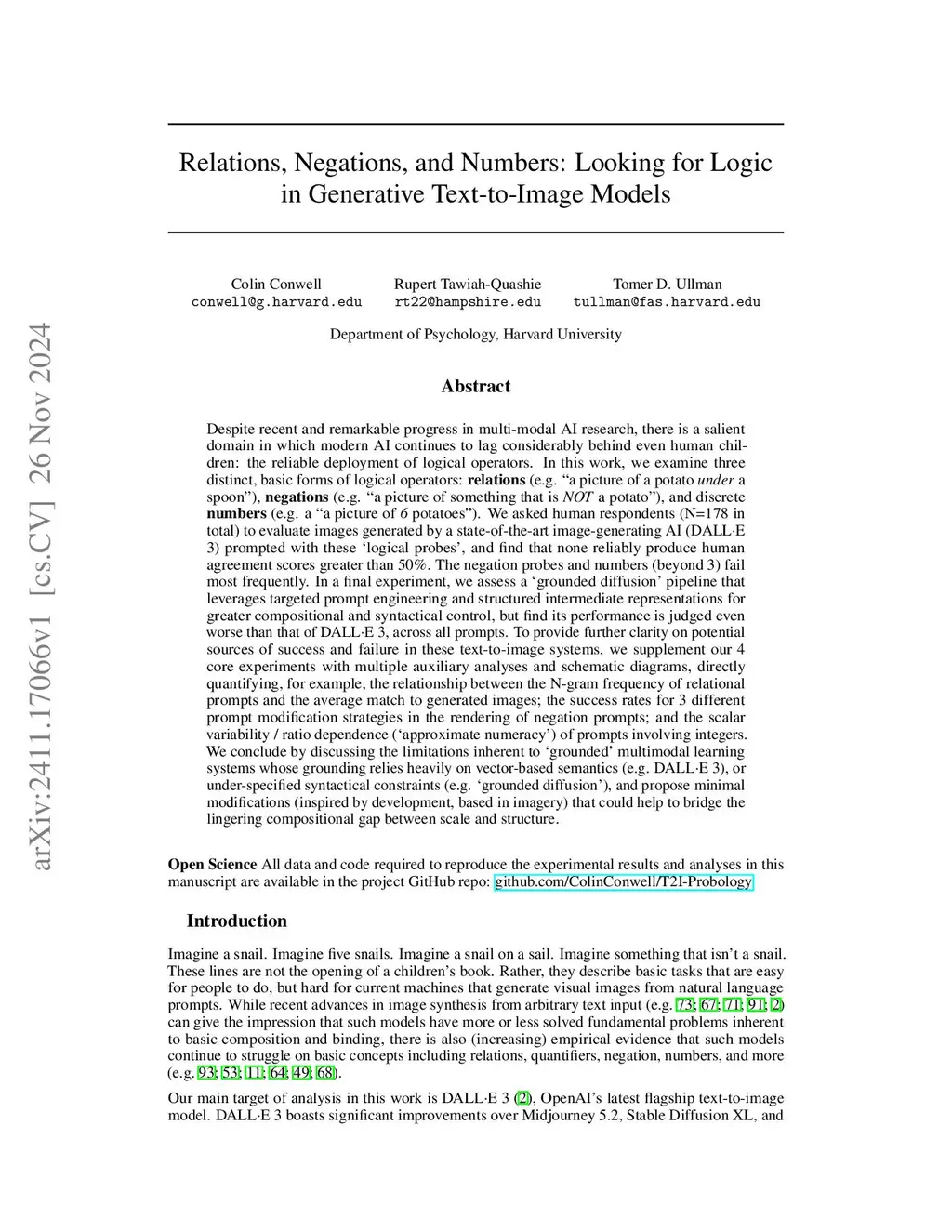 Despite remarkable progress in multi-modal AI research, there is a salient domain in which modern AI continues to lag considerably behind even human children: the reliable deployment of logical operators. Here, we examine three forms of logical operators: relations, negations, and discrete numbers. We asked human respondents (N=178 in total) to evaluate images generated by a state-of-the-art image-generating AI (DALL-E 3) prompted with these `logical probes', and find that none reliably produce human agreement scores greater than 50\%. The negation probes and numbers (beyond 3) fail most frequently. In a 4th experiment, we assess a `grounded diffusion' pipeline that leverages targeted prompt engineering and structured intermediate representations for greater compositional control, but find its performance is judged even worse than that of DALL-E 3 across prompts. To provide further clarity on potential sources of success and failure in these text-to-image systems, we supplement our 4 core experiments with multiple auxiliary analyses and schematic diagrams, directly quantifying, for example, the relationship between the N-gram frequency of relational prompts and the average match to generated images; the success rates for 3 different prompt modification strategies in the rendering of negation prompts; and the scalar variability / ratio dependence (`approximate numeracy') of prompts involving integers. We conclude by discussing the limitations inherent to `grounded' multimodal learning systems whose grounding relies heavily on vector-based semantics (e.g. DALL-E 3), or under-specified syntactical constraints (e.g. `grounded diffusion'), and propose minimal modifications (inspired by development, based in imagery) that could help to bridge the lingering compositional gap between scale and structure. All data and code is available at https://github.com/ColinConwell/T2I-Probology